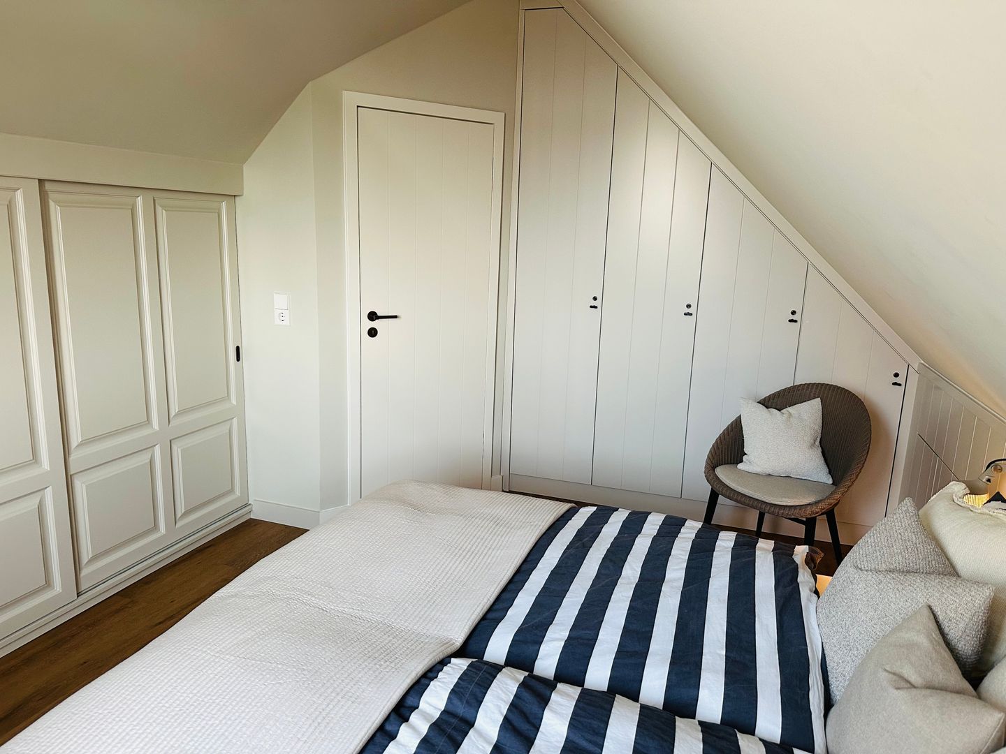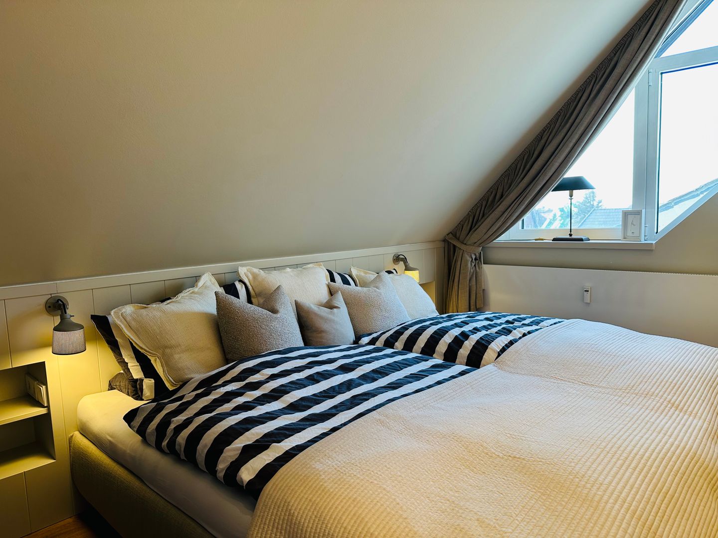 Direkt unter dem Dach befindet sich das 1 Schlafzimmer mit einem großzügigem Doppelbett (200x200cm) und einem Flatscreen TV.