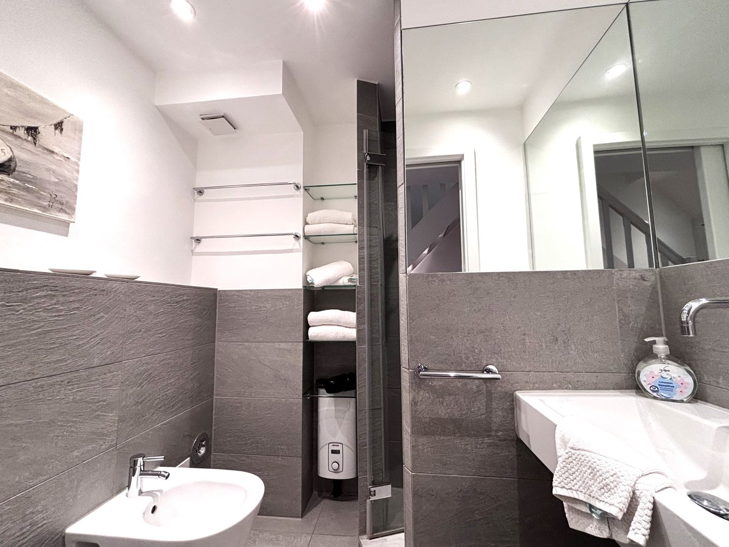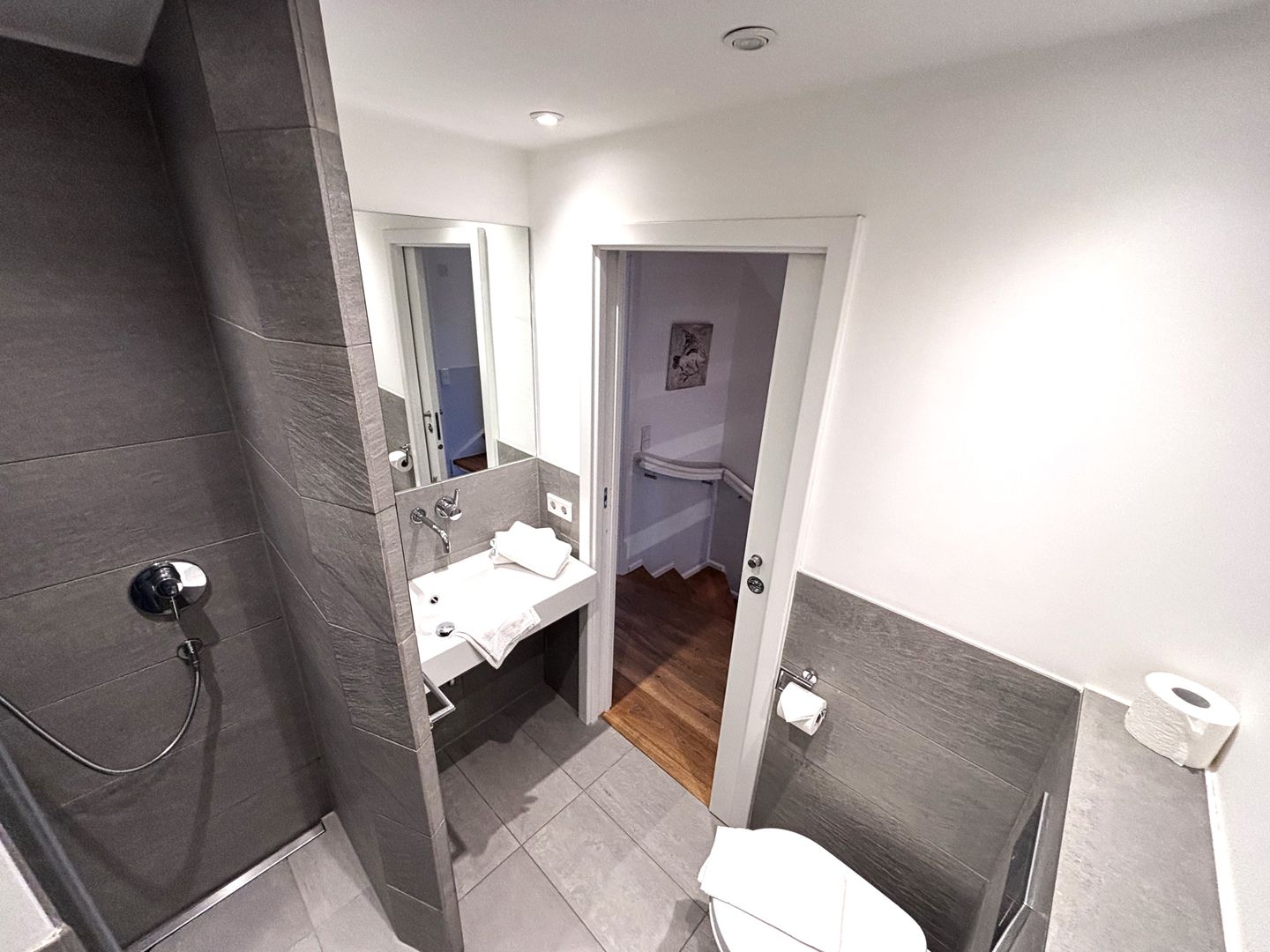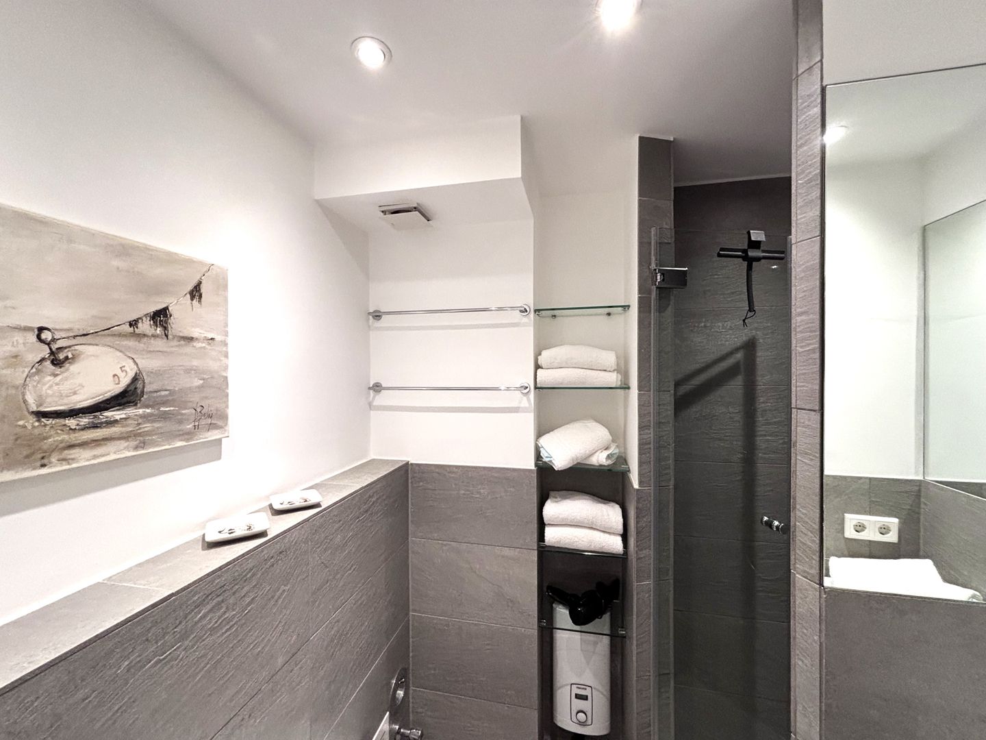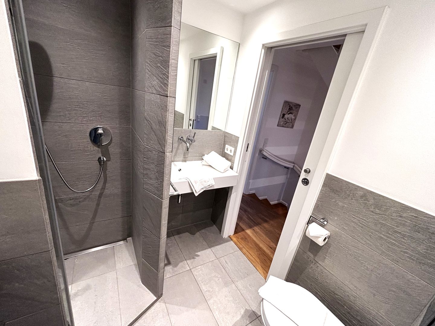 In der Ferienwohnung in Wenningstedt gibt es ein sehr modernes Badezimmer, dessen Optik durch große lichtgraue Fließen geprägt wird. Das Badezimmer befindet sich im Obergeschoss; es verfügt über einen großen Spiegel, eine Dusche, ein WC und ein Bidet.
