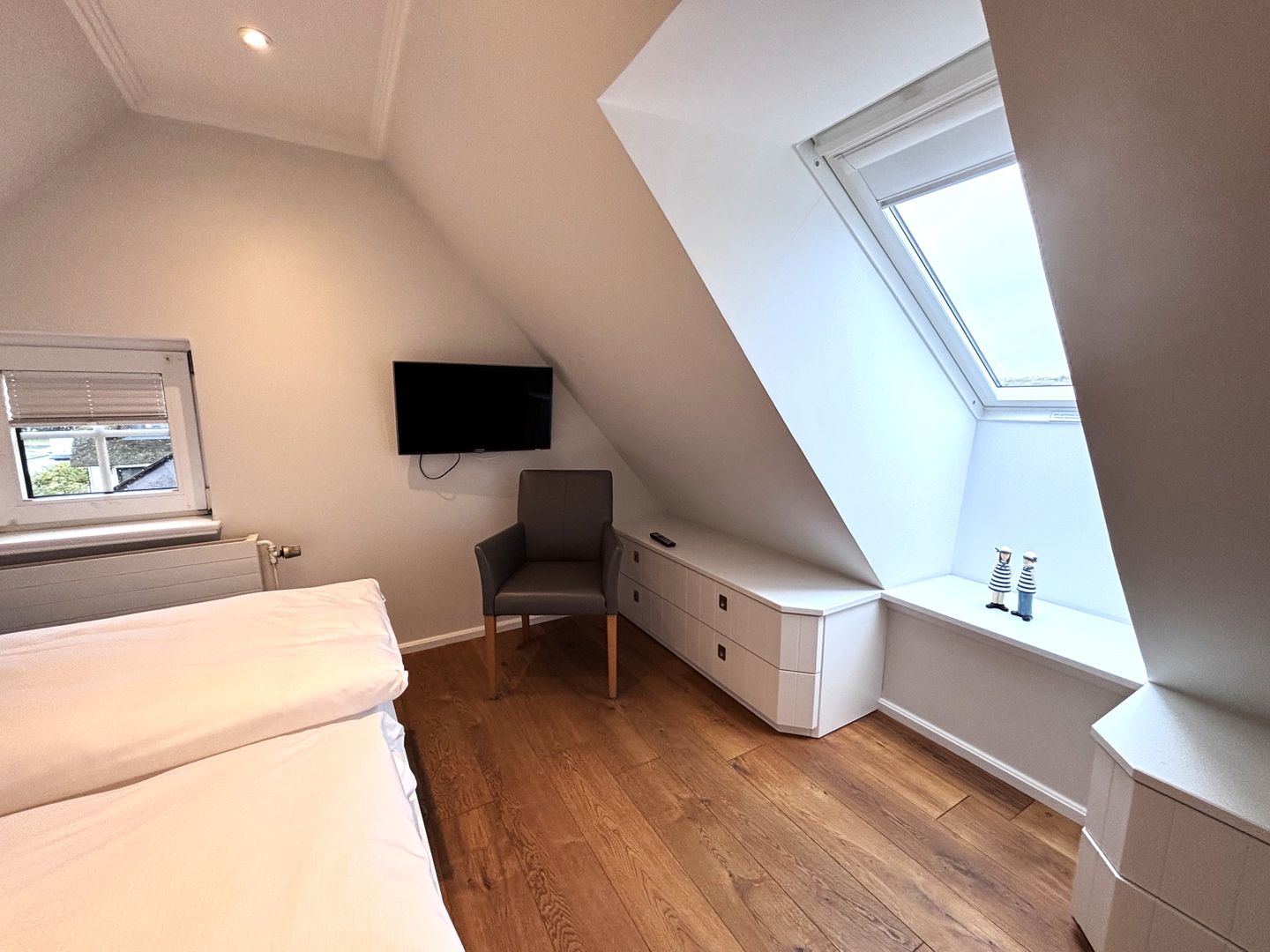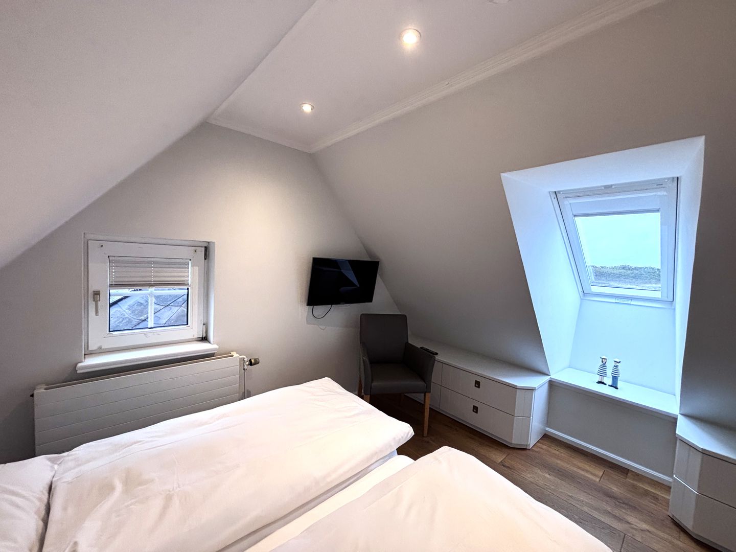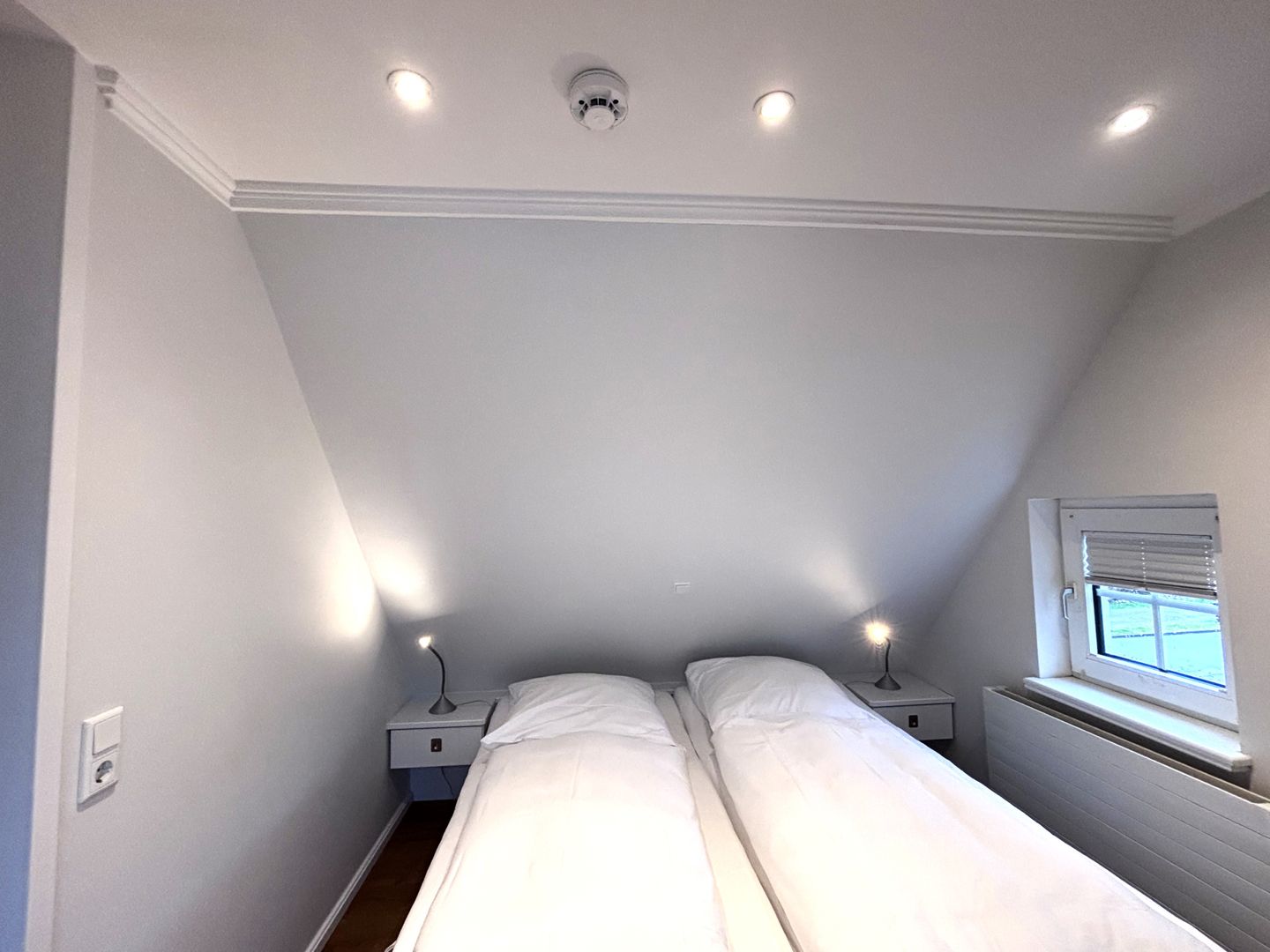 In der Ferienwohnung gibt es zwei Schlafzimmer: Im Obergeschoss befindet sich ein hell eingerichtetes Schlafzimmer 1, das mit einem Einzelbett ausgestattet ist. Das großzügige Schlafzimmer 2 liegt im Dachgeschoss und verfügt über ein Doppelbett, einen Flatscreen-TV und eine Stereoanlage.