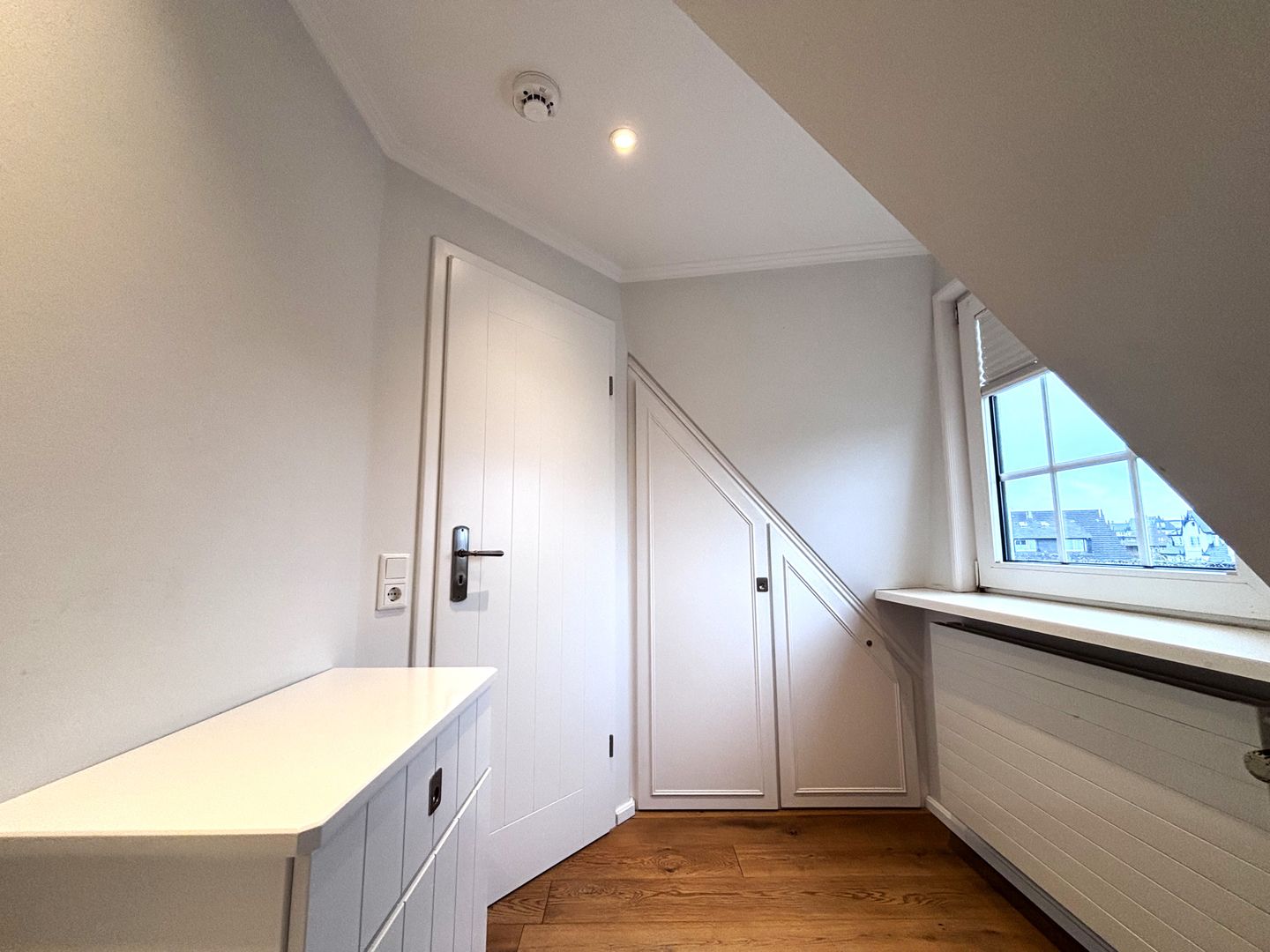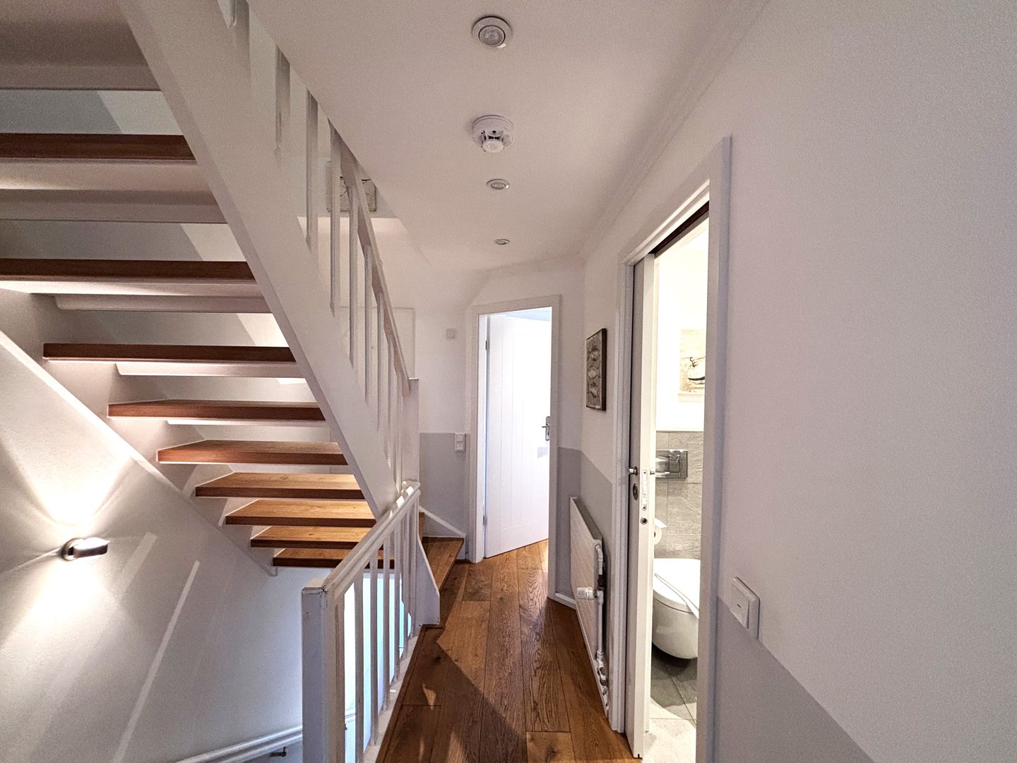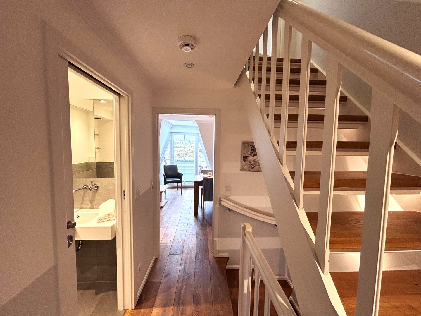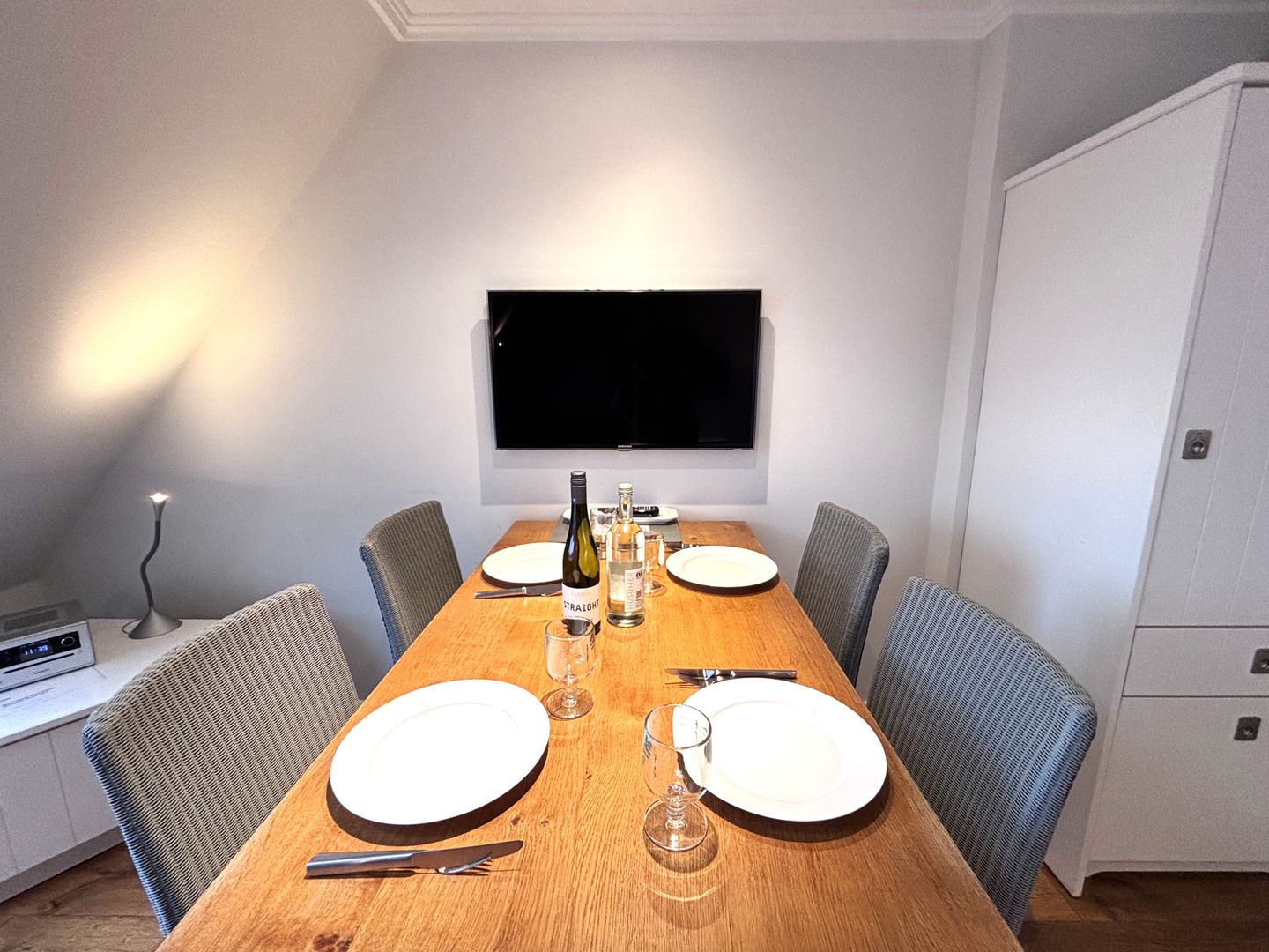 In der Ferienwohnung gibt es zwei Schlafzimmer: Im Obergeschoss befindet sich ein hell eingerichtetes Schlafzimmer 1, das mit einem Einzelbett ausgestattet ist. Das großzügige Schlafzimmer 2 liegt im Dachgeschoss und verfügt über ein Doppelbett, einen Flatscreen-TV und eine Stereoanlage.