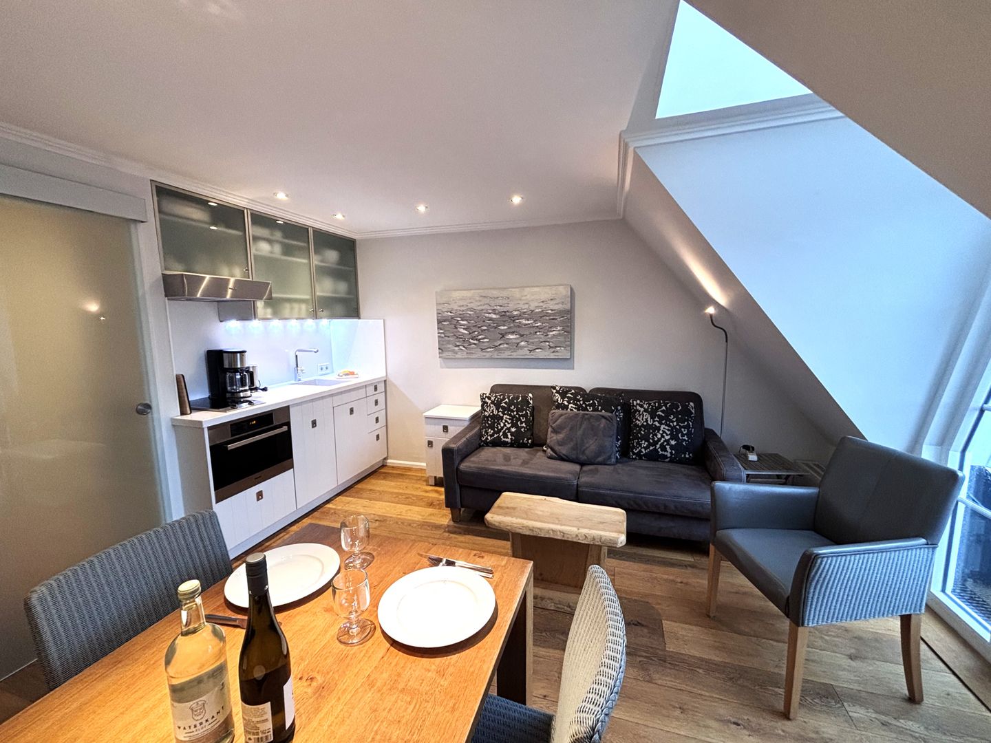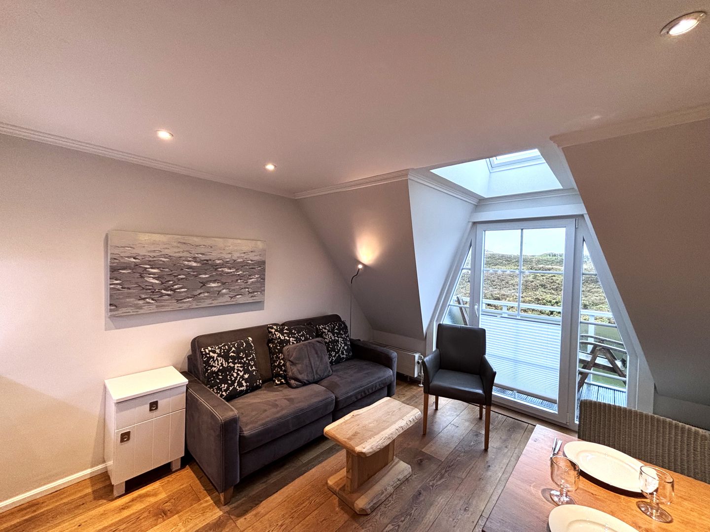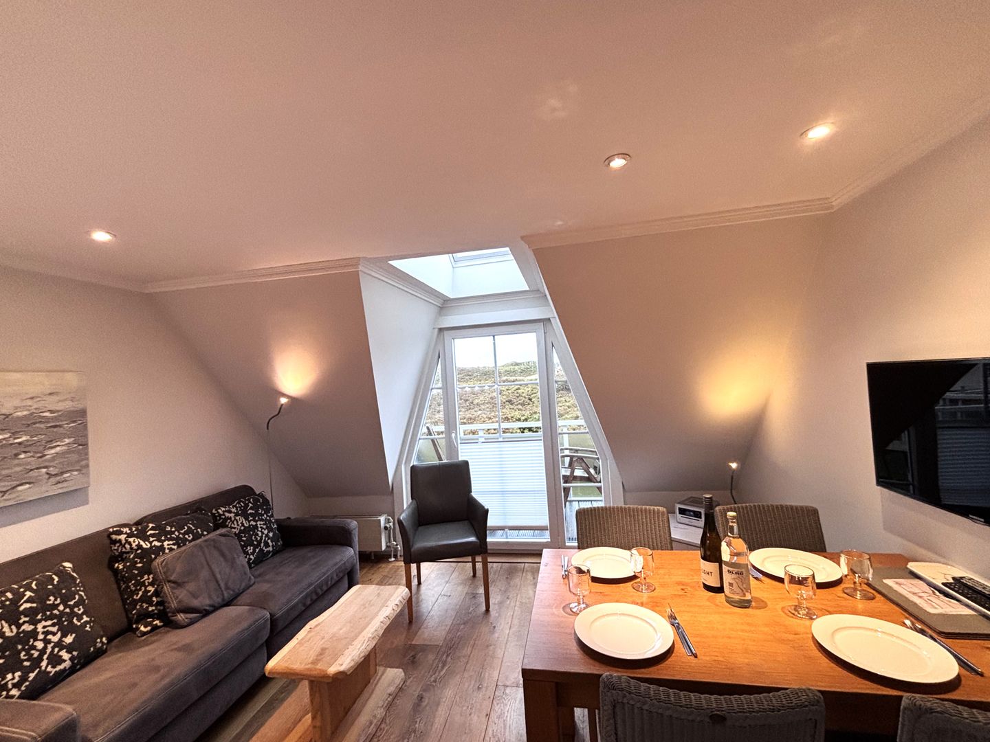 Der helle Wohnbereich ist modern und stilsicher eingerichtet. Durch eine große Fensterfront in Richtung Dünenlandschaft gelangt viel Helligkeit in den Wohnbereich. Hier können die Gäste der FeWi die Füße hochlegen und die technische Ausstattung bestehend aus Flatscreen TV, Stereoanlage und iPhone/iPod-Dockingstation und W-LAN auskosten.