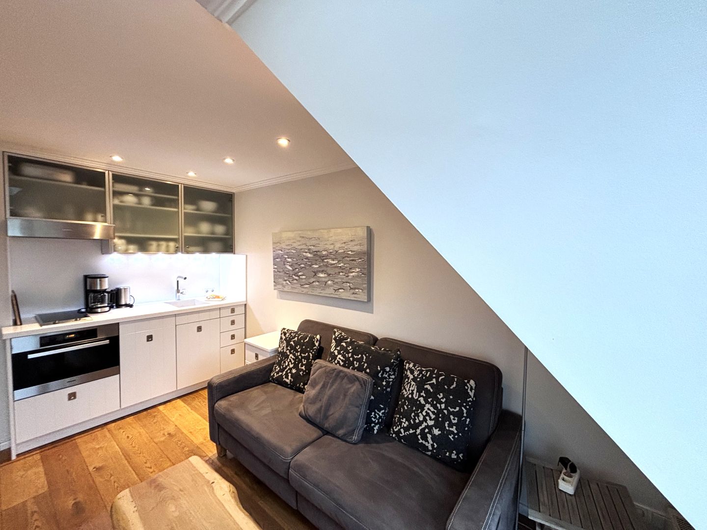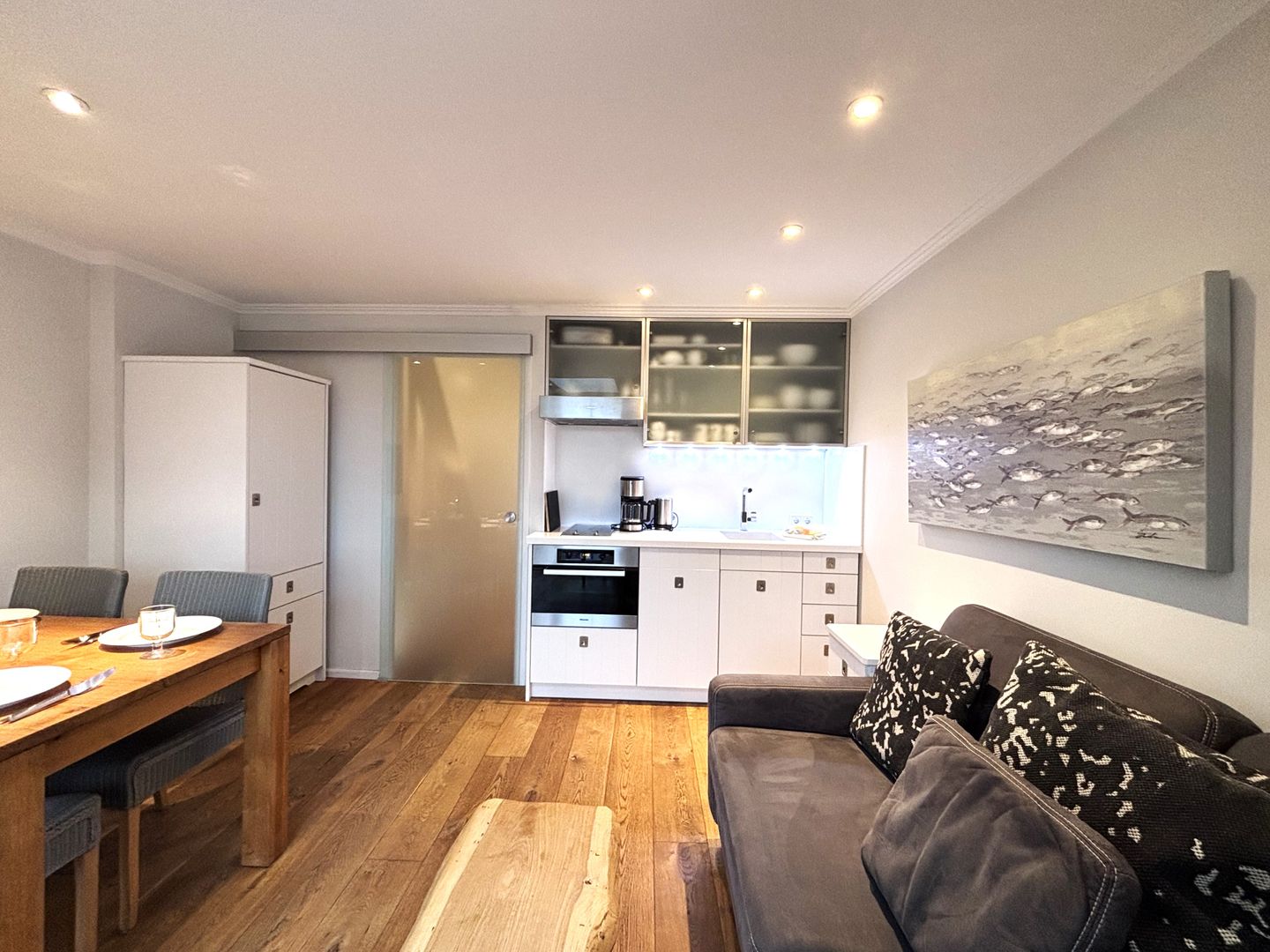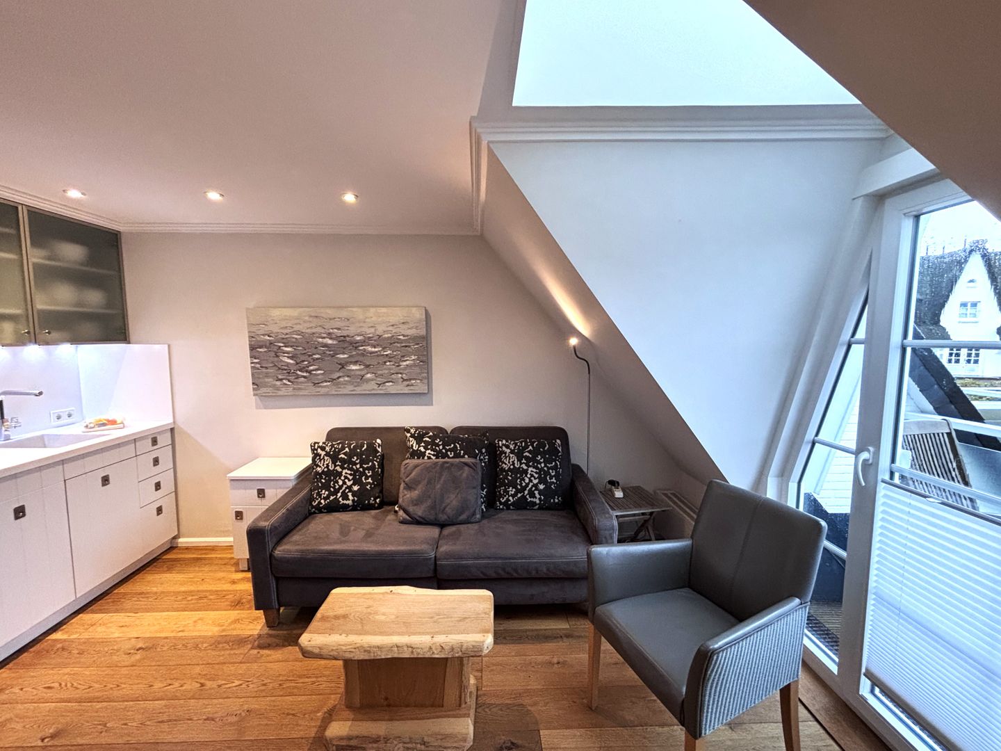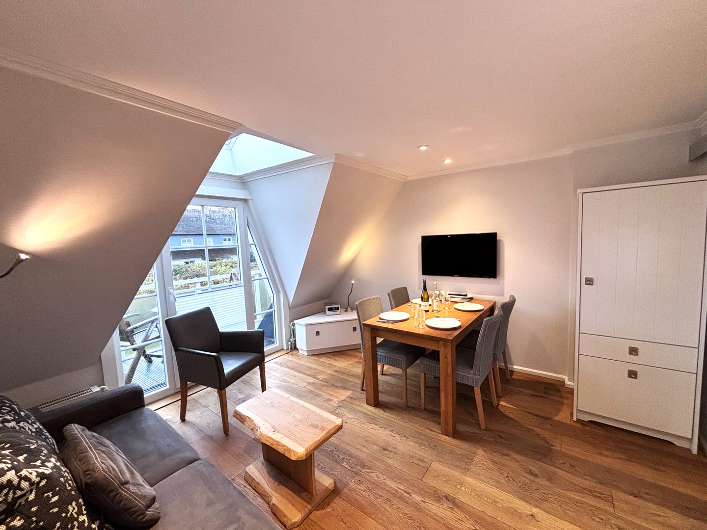 Der helle Wohnbereich ist modern und stilsicher eingerichtet. Durch eine große Fensterfront in Richtung Dünenlandschaft gelangt viel Helligkeit in den Wohnbereich. Hier können die Gäste der FeWi die Füße hochlegen und die technische Ausstattung bestehend aus Flatscreen TV, Stereoanlage und iPhone/iPod-Dockingstation und W-LAN auskosten.