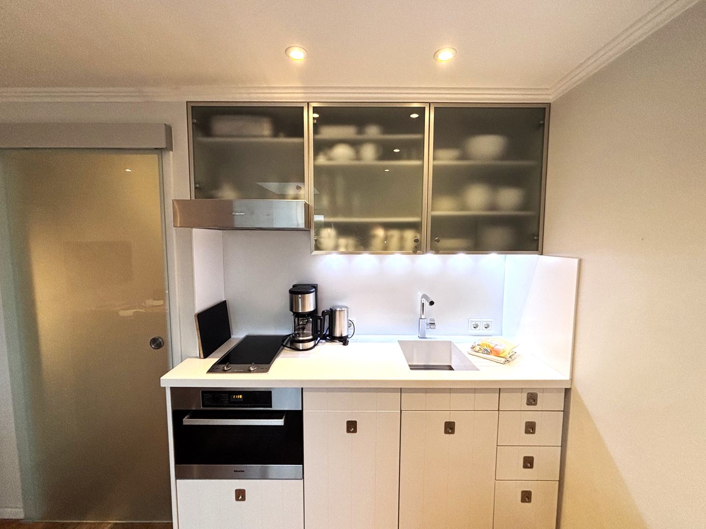 Die offene Küchenzeile besticht durch ihre moderne graue Optik. Die indirekte Beleuchtung schafft gerade in den Abendstunden eine besondere Atmosphäre. Am Echtholztisch im Essbereich kann man gemeinsam Speisen oder gesellige Stunden verbringen.