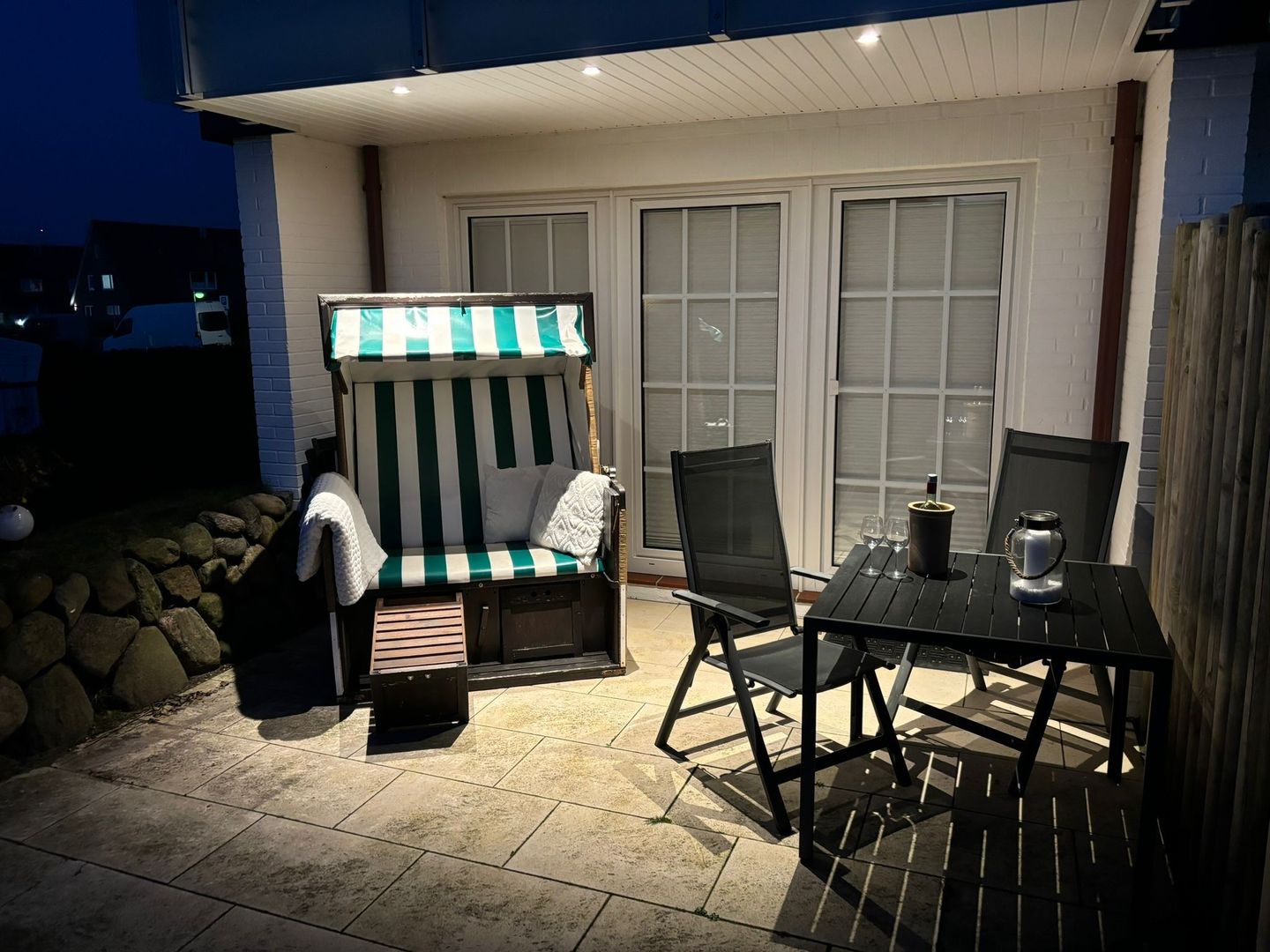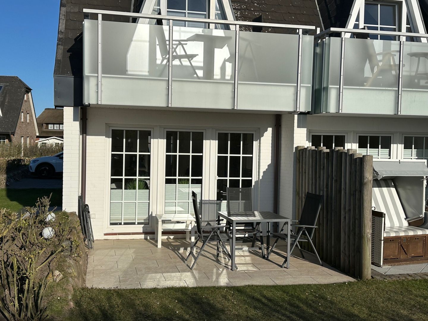 Auf der Westterrasse der Ferienwohnung steht die Gäste ein typischer Sylter Strandkorb zur Verfügung. Darauf können Sylt-Urlauber warme Sonnenbäder genießen und sich entspannt zurücklehnen. Die Gartenmöbel bieten sich für ein Frühstück an der frischen Nordseeluft an.