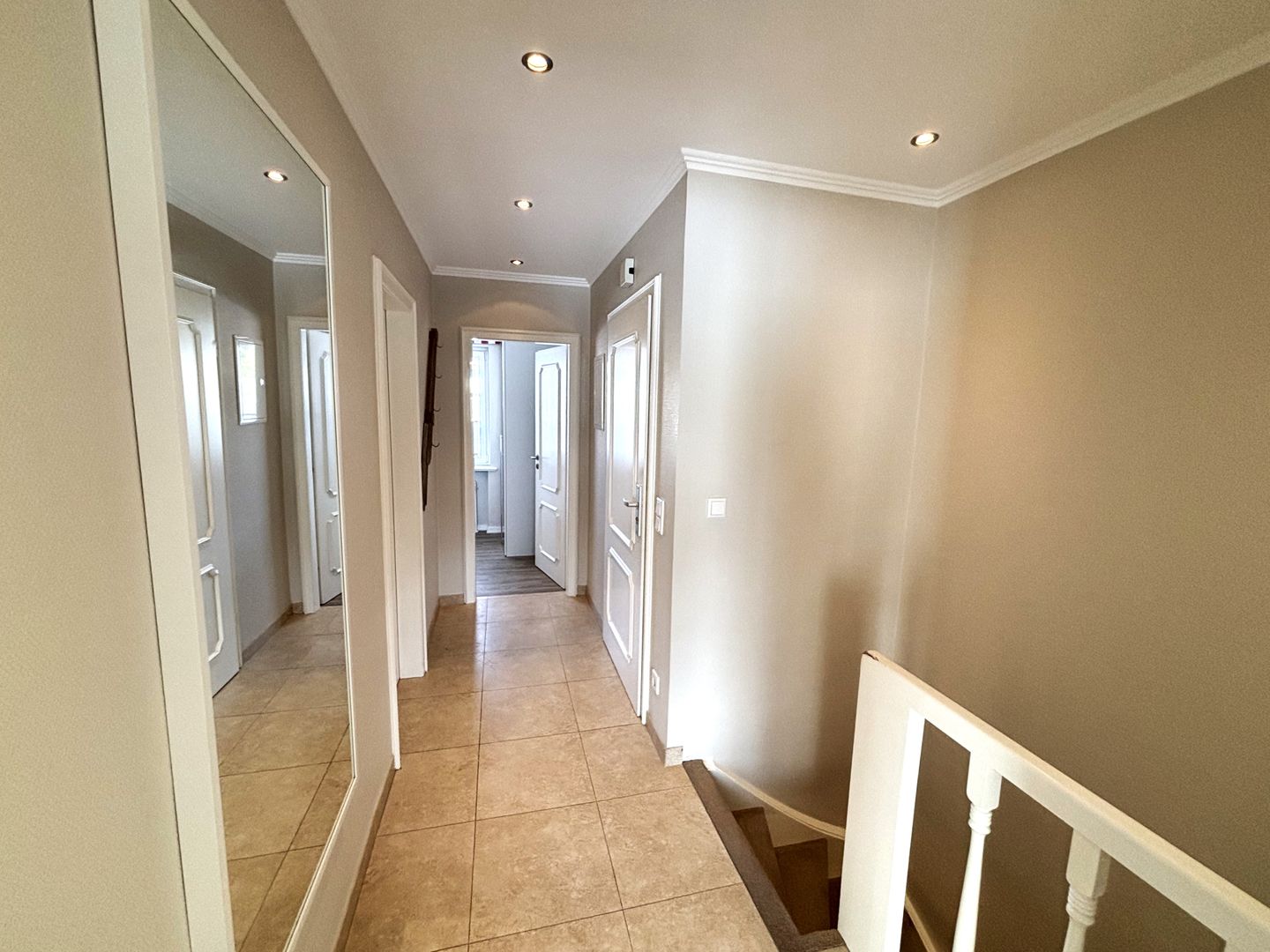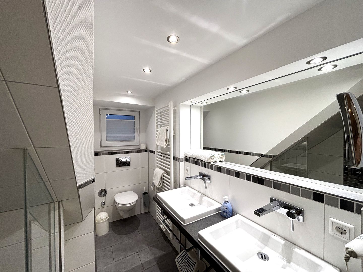 Im Untergeschoss befindet sich das moderne Badezimmer. Es verfügt über 2 Waschbecken, Haartrockner, Kosmetikspiegel, sowie 1 WC und 1 Dusche (Achtung! Treppenstufe)