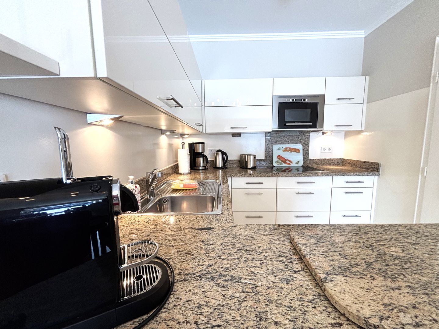Die U-förmige Küche lässt keine Wünsche offen. Neben einem 4-Platten-Ceran Kochfeld, steht Ihnen bspw. eine Delonghi Nespressomaschine zur Verfügung.