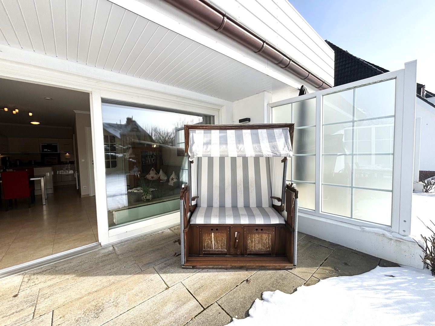 Ferienwohnung mit Terrasse und Strandkorb.