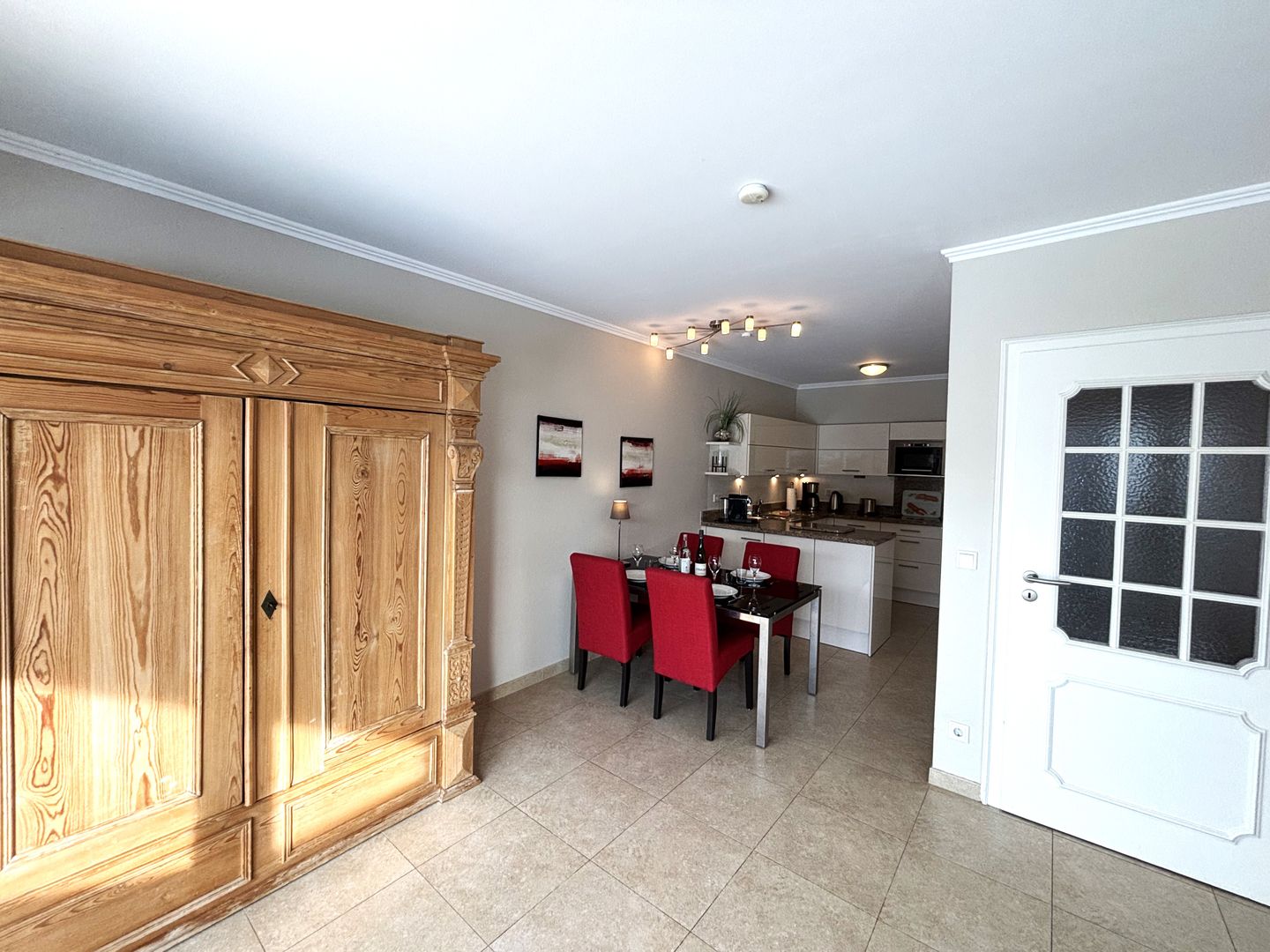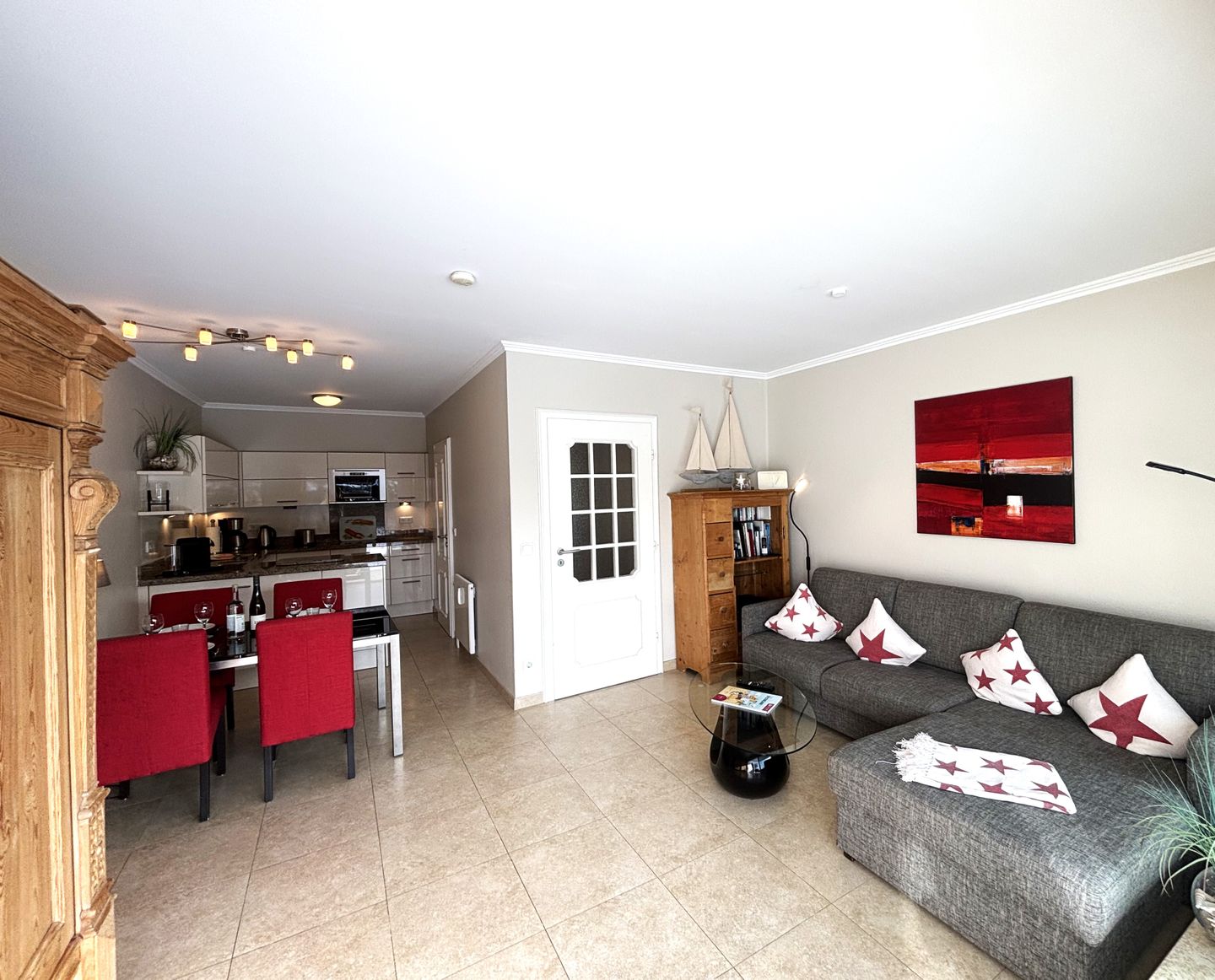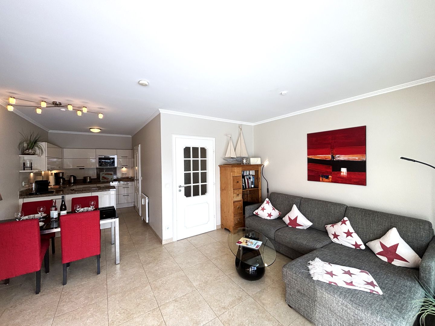 Für reichlich Geschirr und Besteck ist ebenfalls gesorgt. An dem Esstisch mit den roten Stühlen finden bis zu 4 Personen Platz.