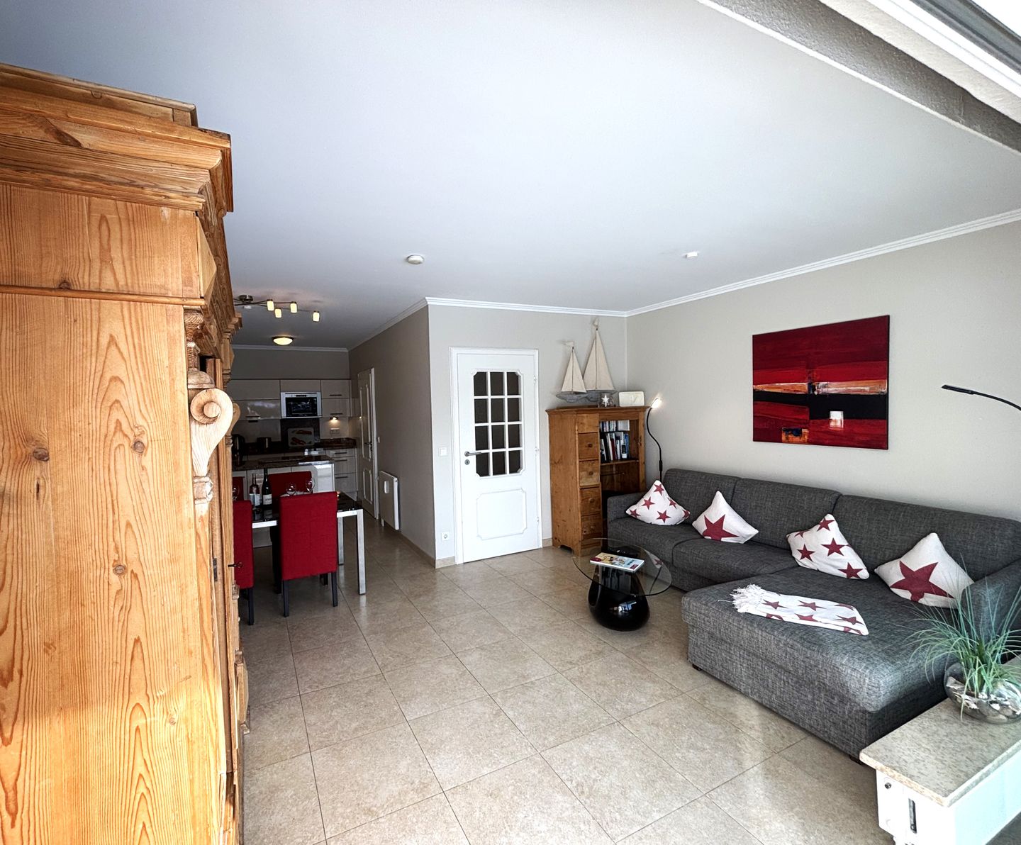 Dank einer großen Fensterfront und der angrenzenden Terrasse ist der gesamte Wohnbereich lichtdurchflutet. Alle Gäste finden auf der gemütlichen grauen Couch einen Platz. Zur medialen Ausstattung gehört ein Flatscreen-TV, sowie ein Radio inkl. CD-Player.