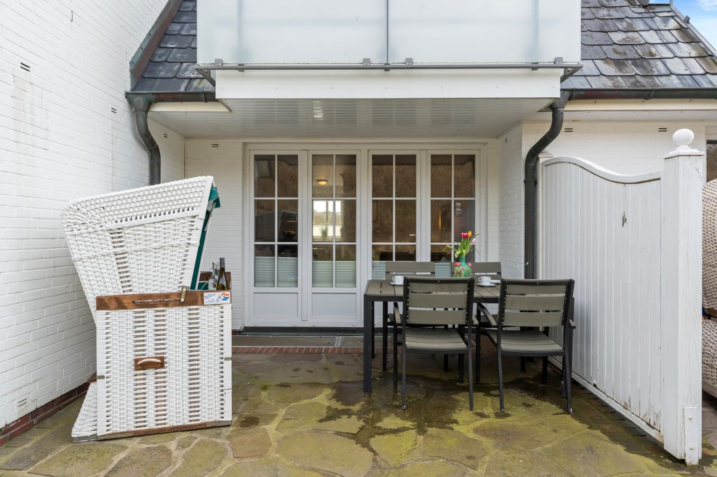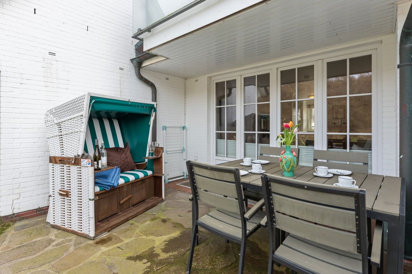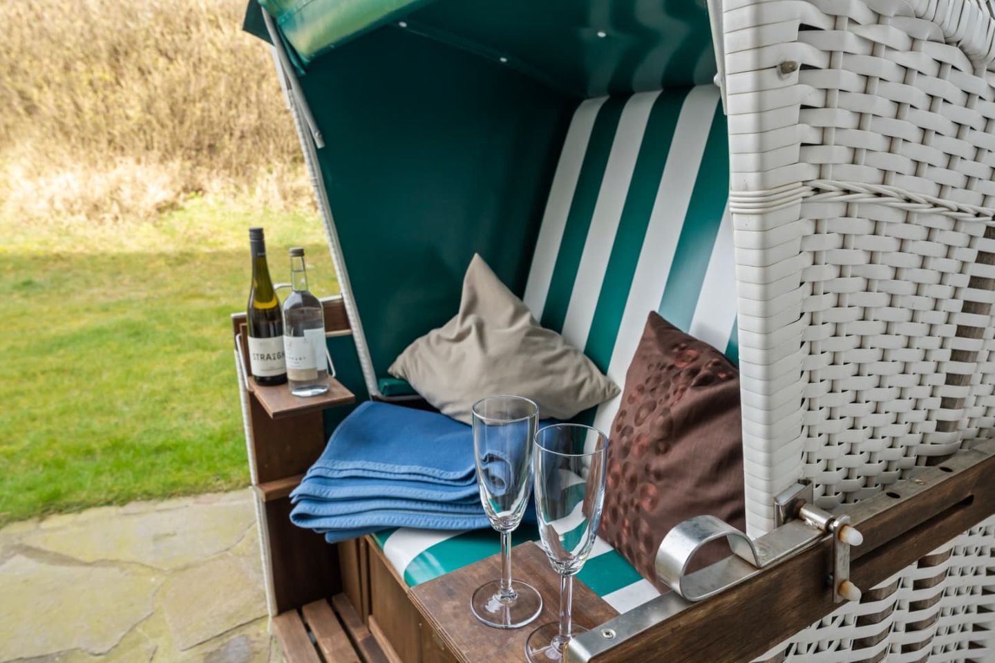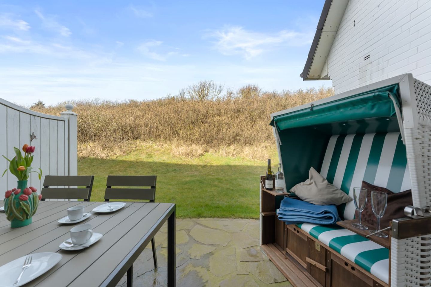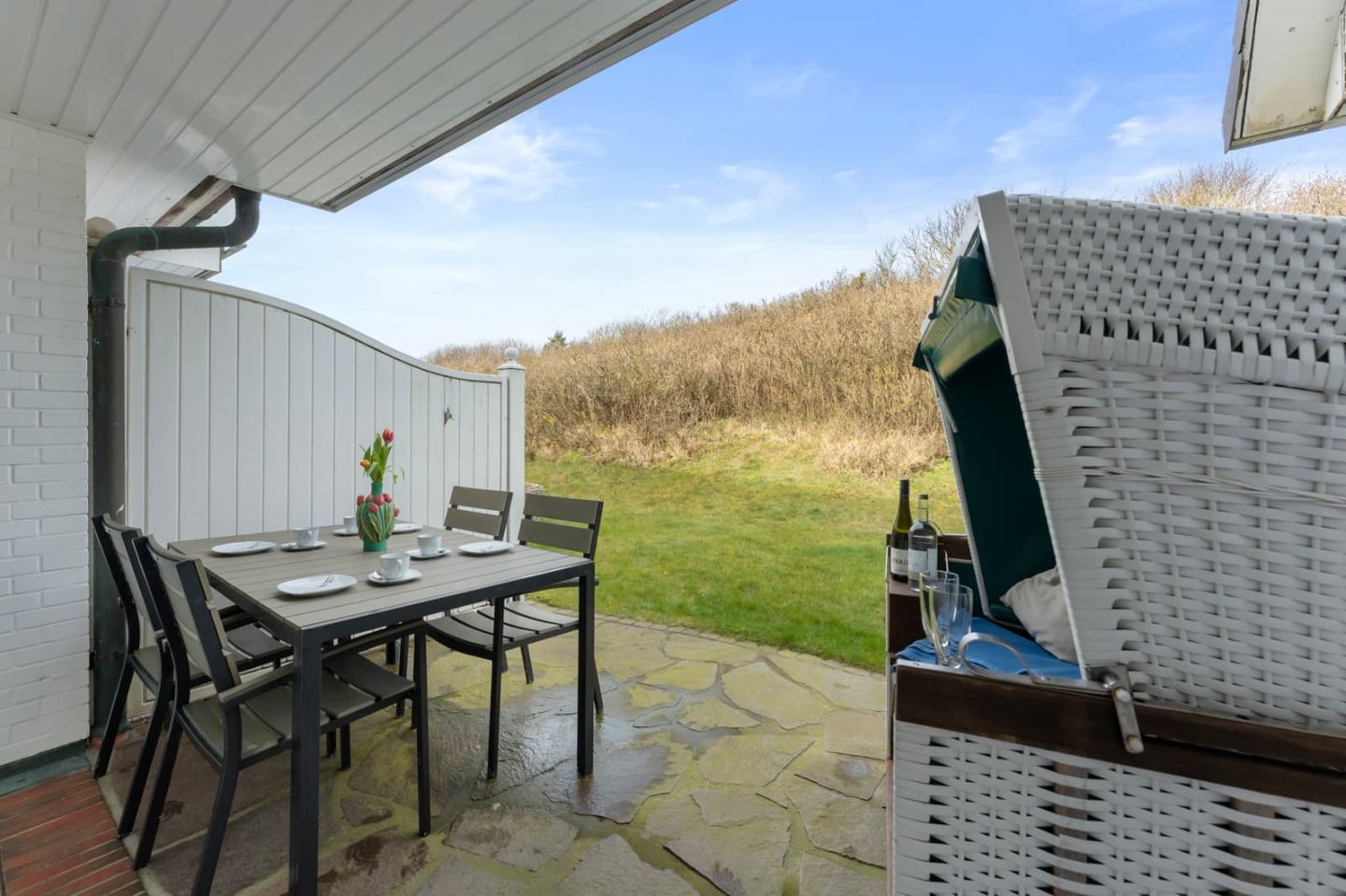 Auf der großen, möblierten Westterrasse können sie das Meer rauschen hören. Ein traditioneller Strandkorb ist der perfekte Ort, um die Sonne zu genießen.