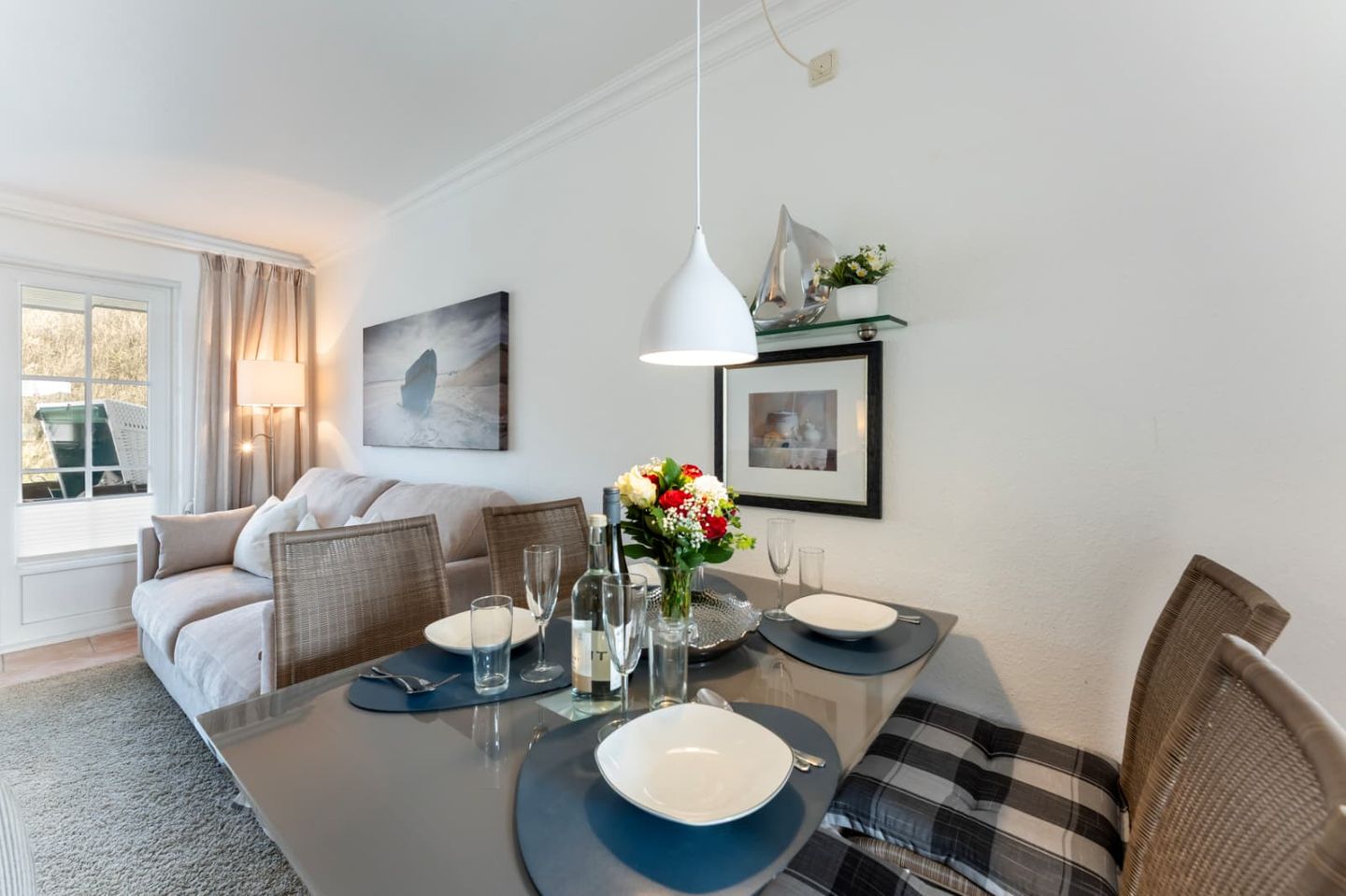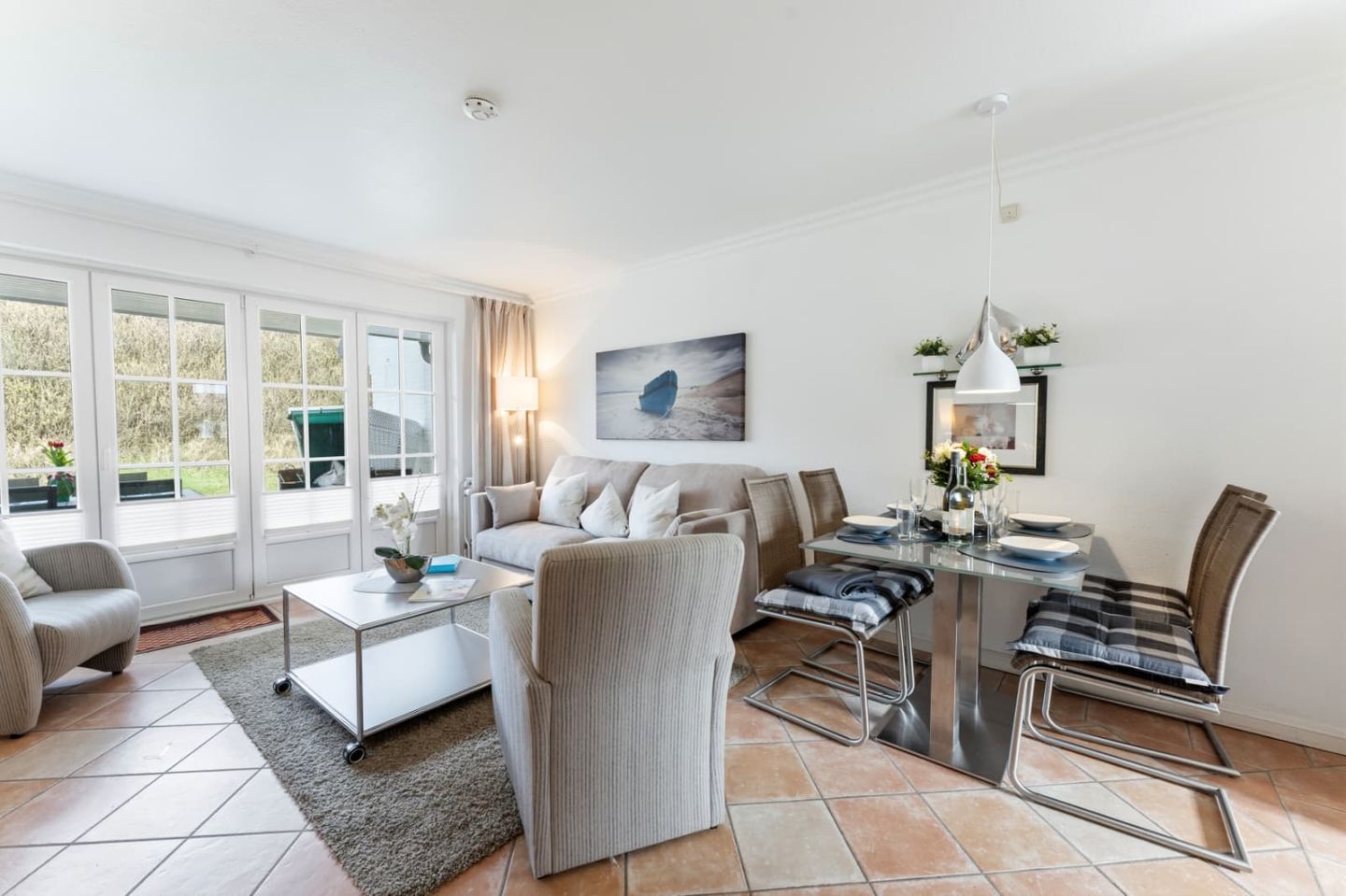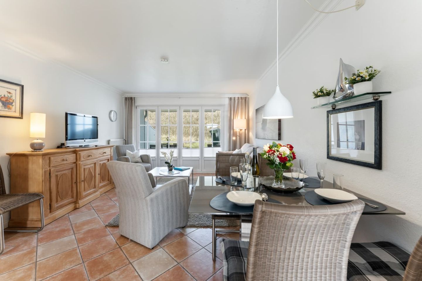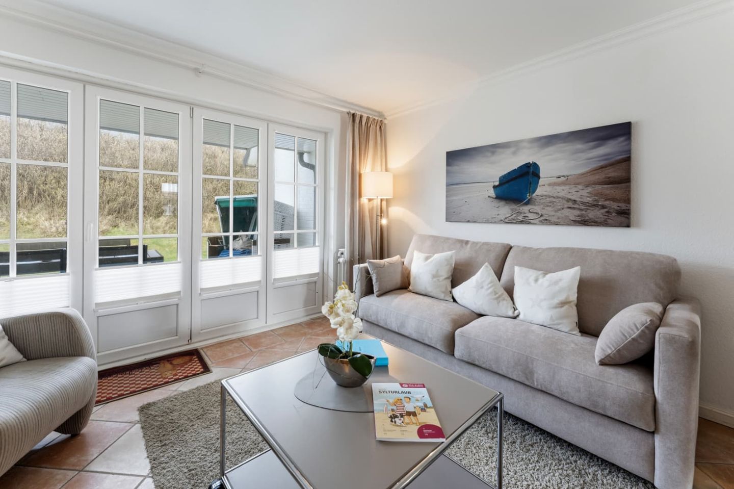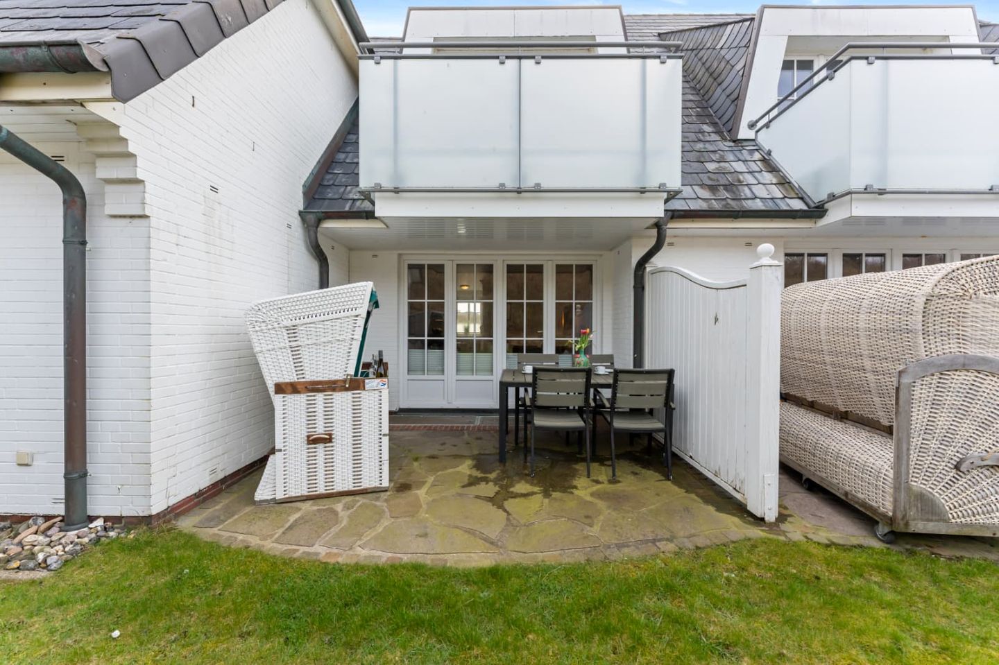 Auf der großen, möblierten Westterrasse können sie das Meer rauschen hören. Ein traditioneller Strandkorb ist der perfekte Ort, um die Sonne zu genießen.