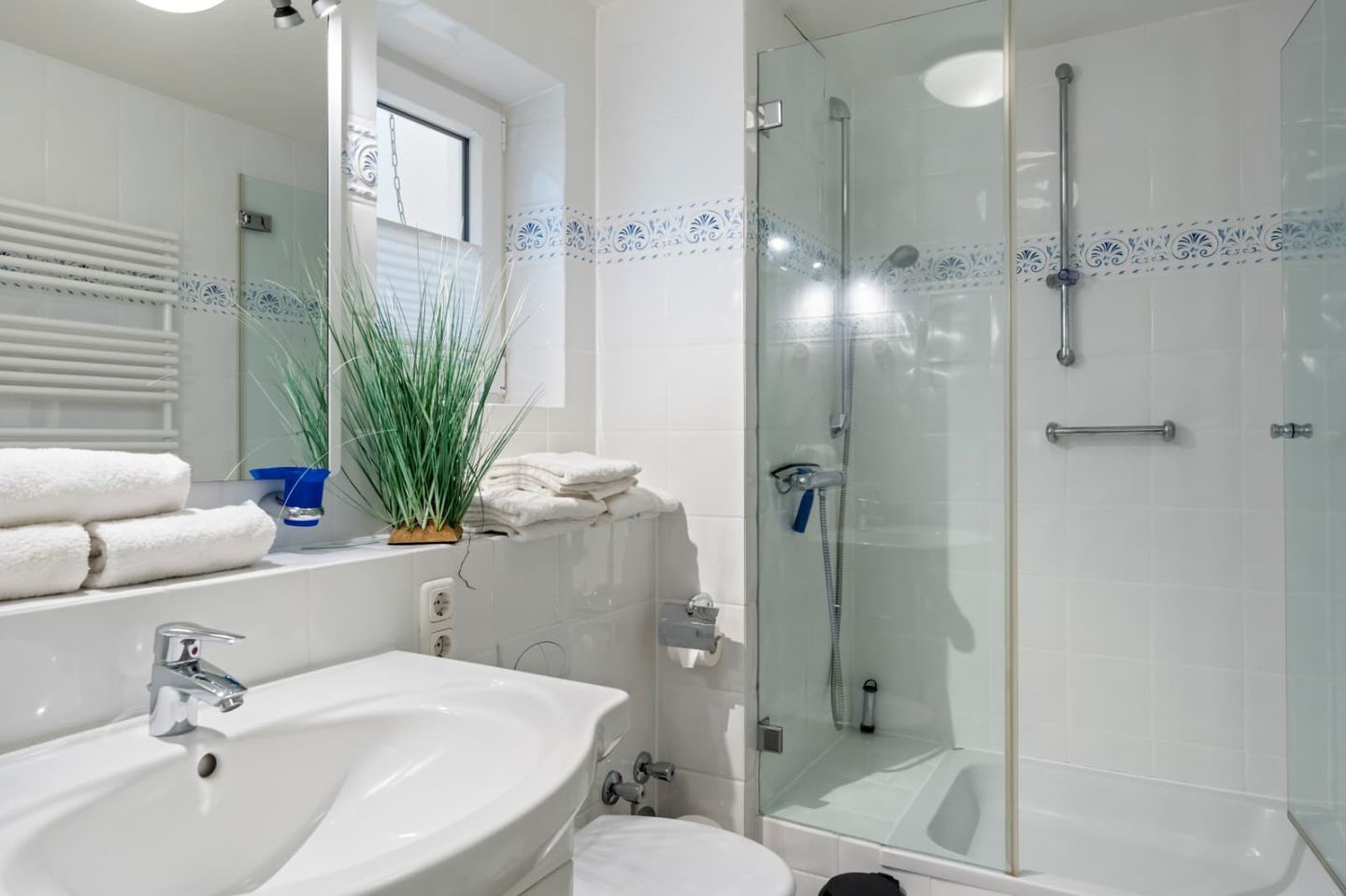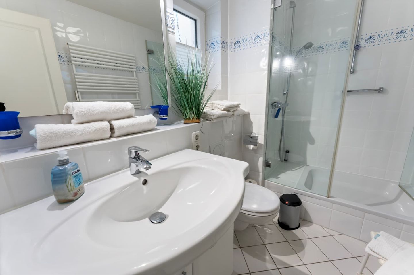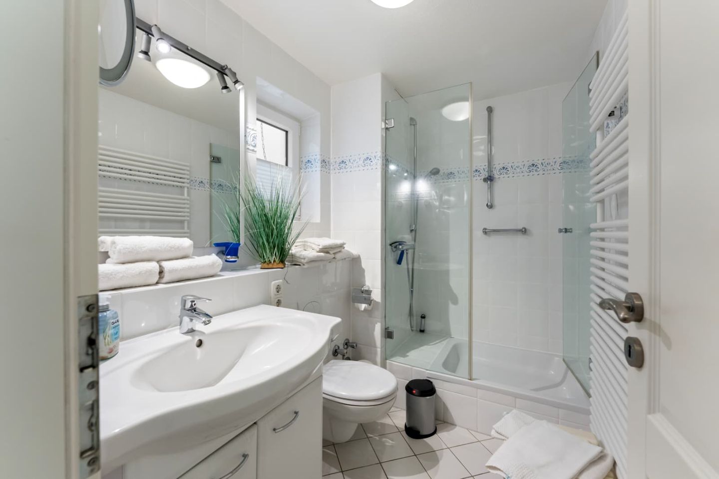 Das helle Badezimmer 1 bietet viel Platz und eine große Duschkabine mit tiefem Einstieg im Untergeschoss. Die Ferienwohnung verfügt zusätzlich über ein Gäste-WC.