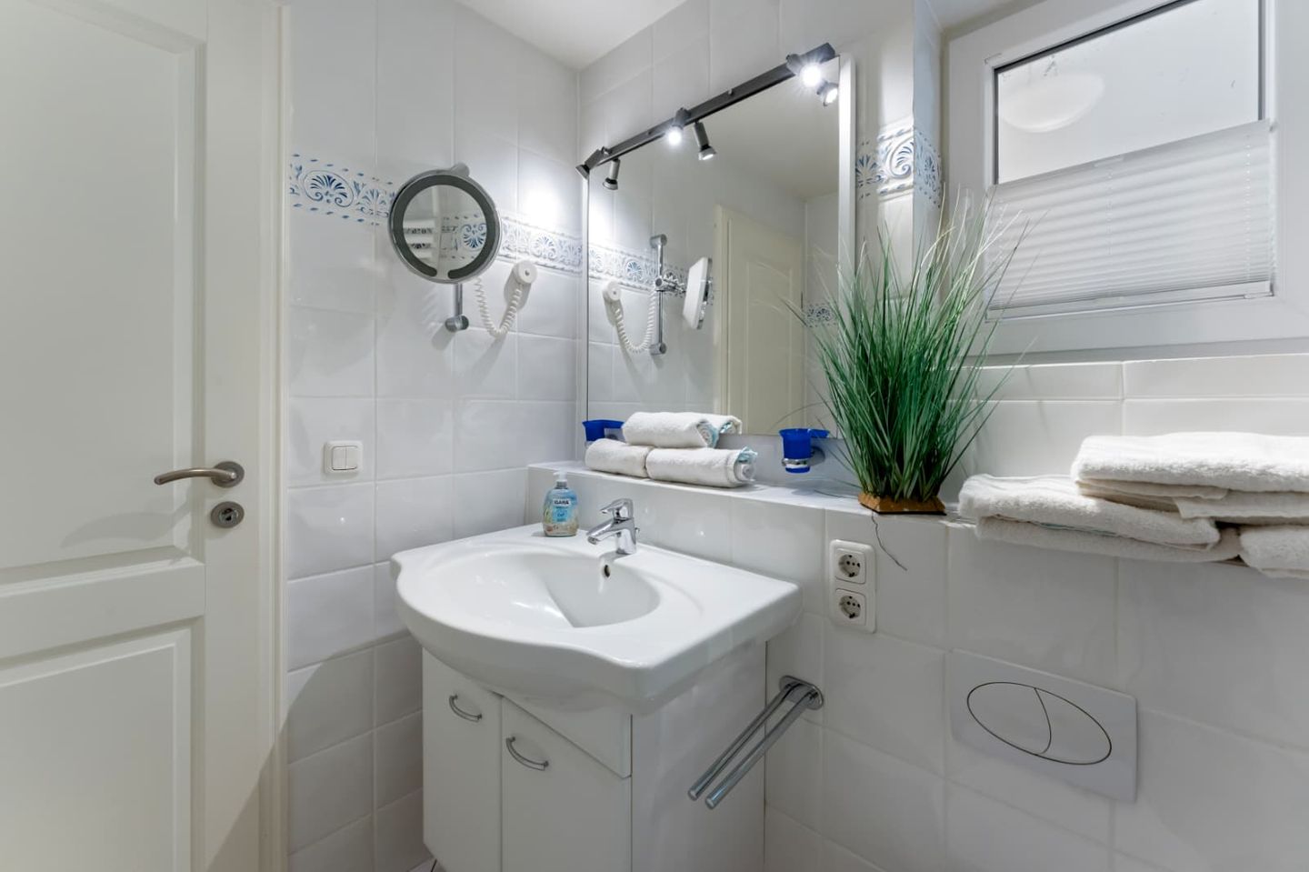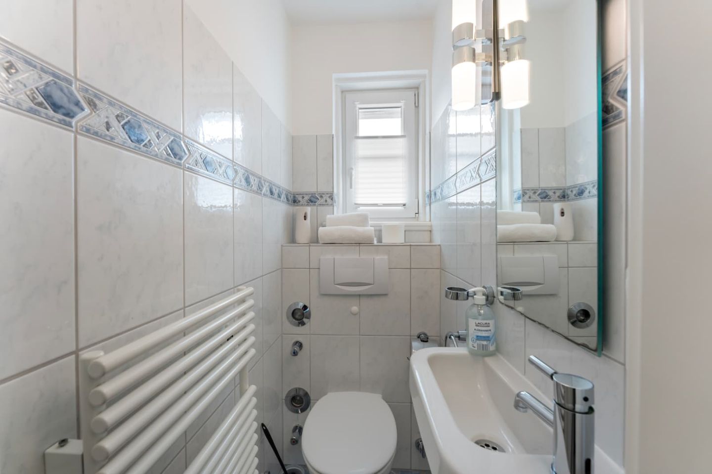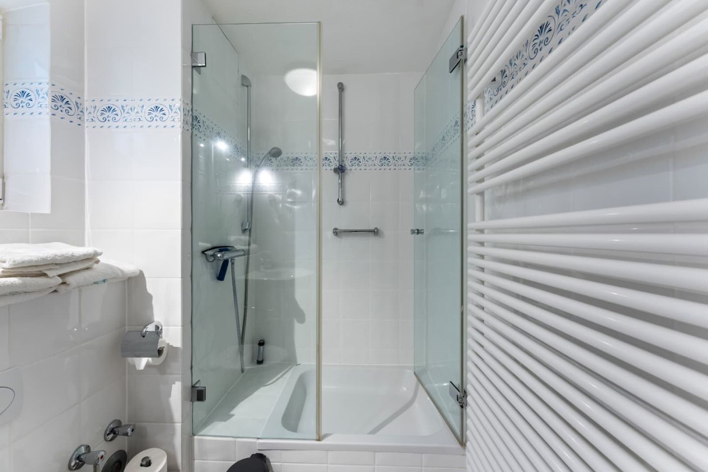 Das helle Badezimmer 1 bietet viel Platz und eine große Duschkabine mit tiefem Einstieg im Untergeschoss. Die Ferienwohnung verfügt zusätzlich über ein Gäste-WC.
