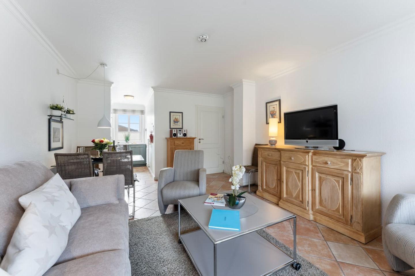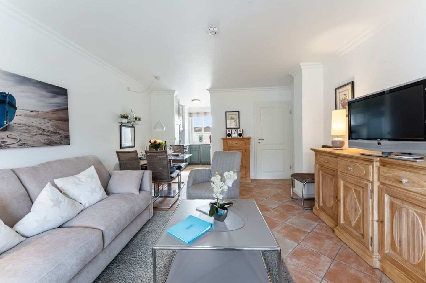 Die Urlauber können auf einer komfortablen Couch relaxen. Ein Flatscreen TV und eine HiFi-Anlage komplettieren die Ausstattung in technischer Hinsicht.
