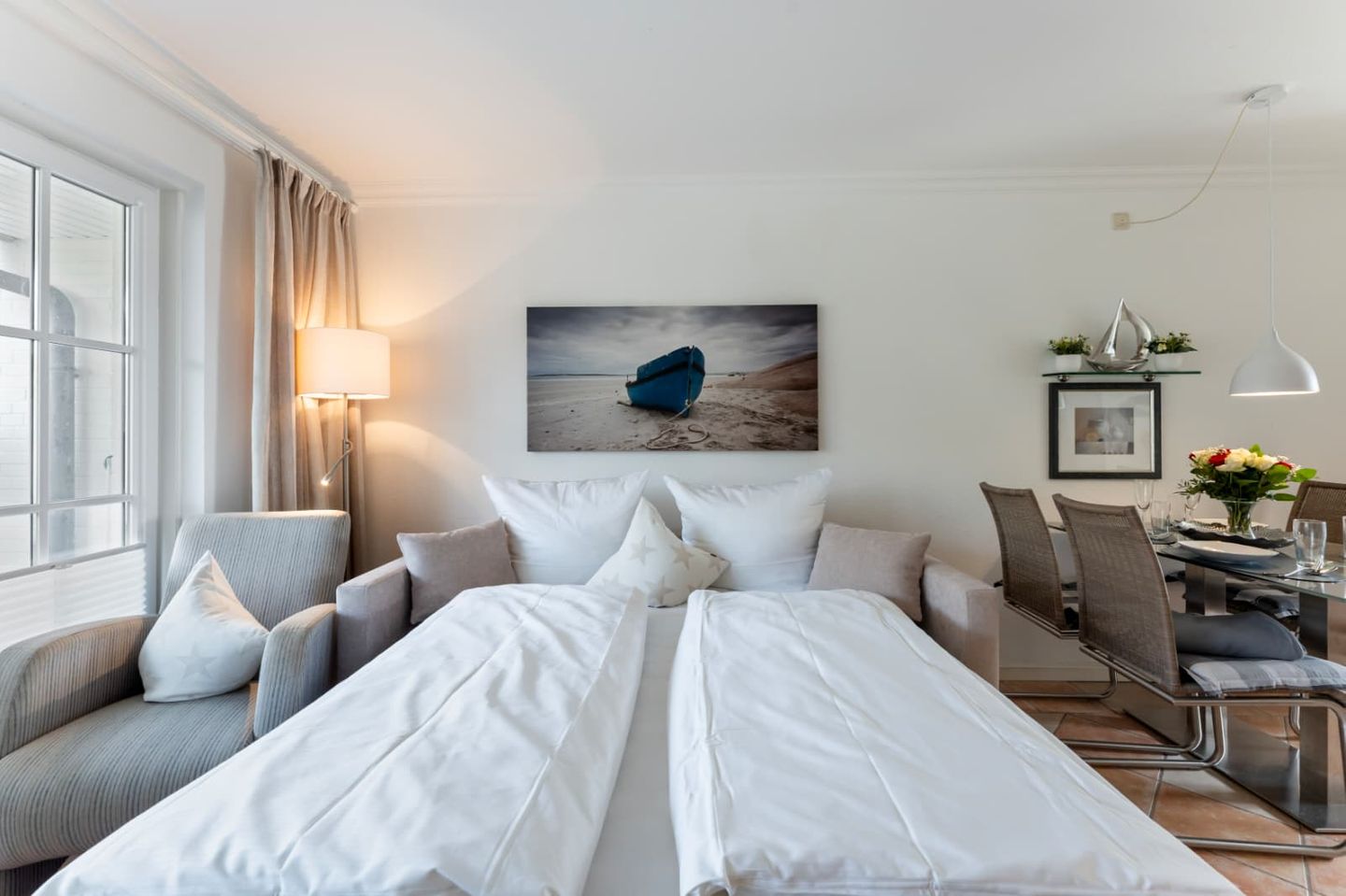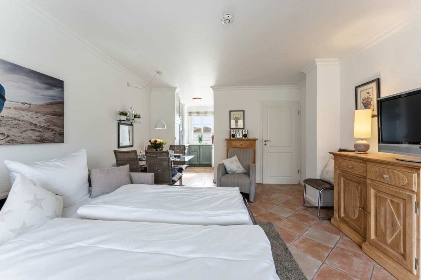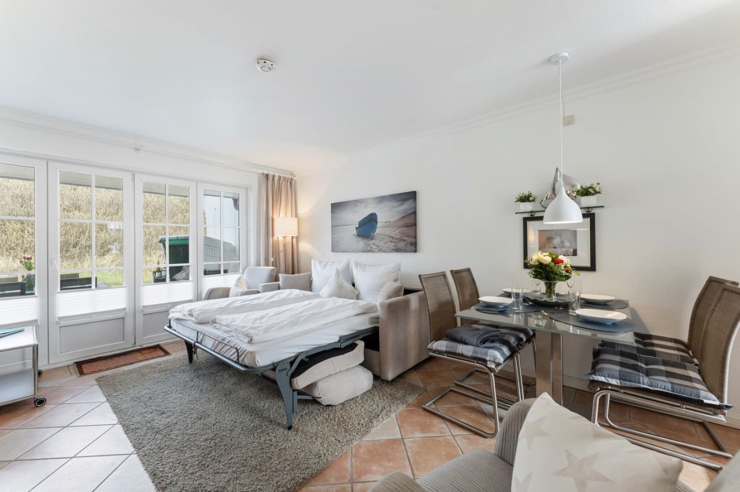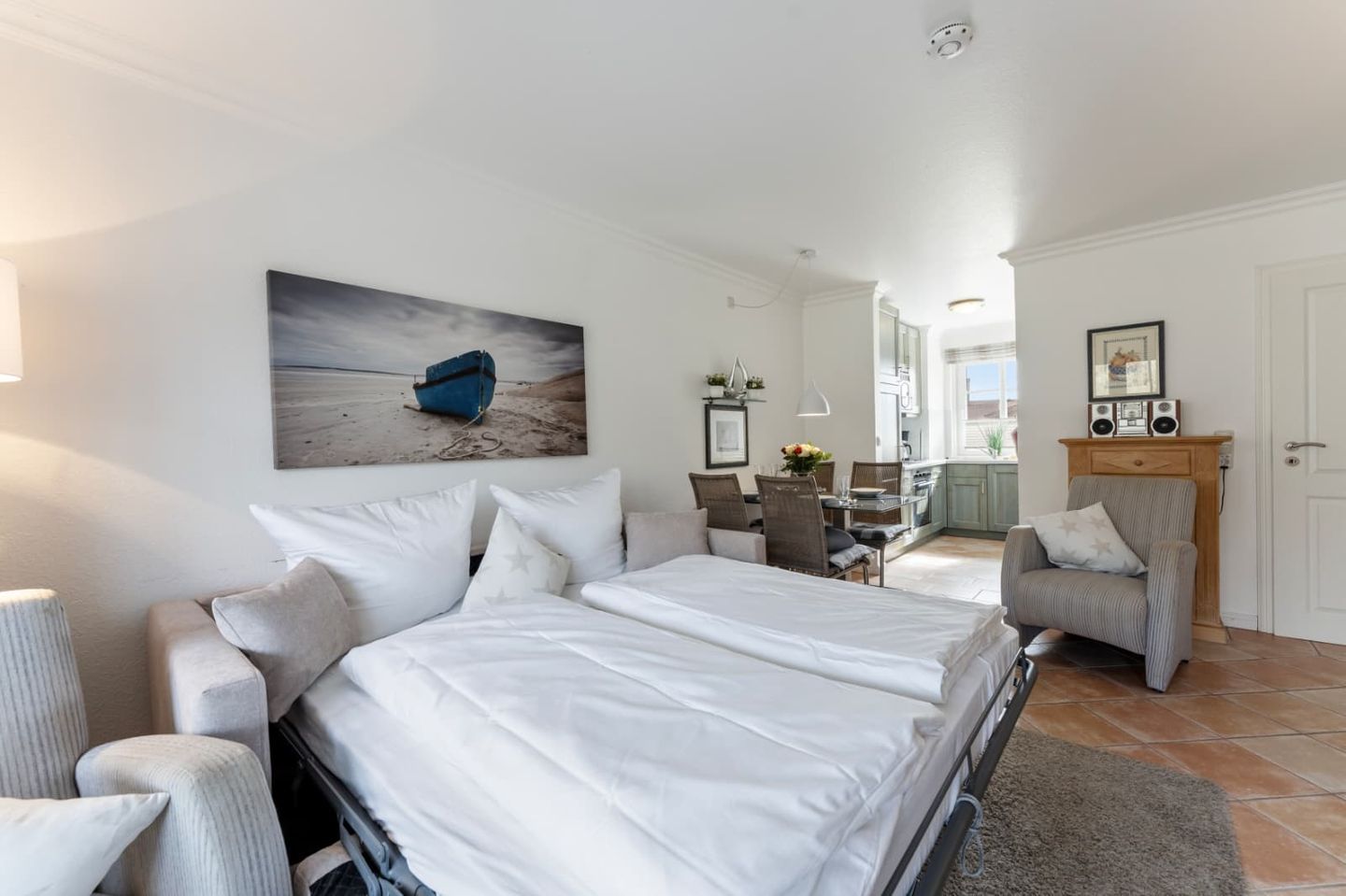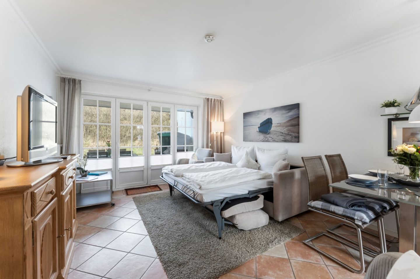 Der Schlafbereich, der mit dem Wohnraum kombiniert wurde, ist mit einer gemütlichen Schlafcouch (160x200cm) und einem Flatscreen-TV ausgestattet.