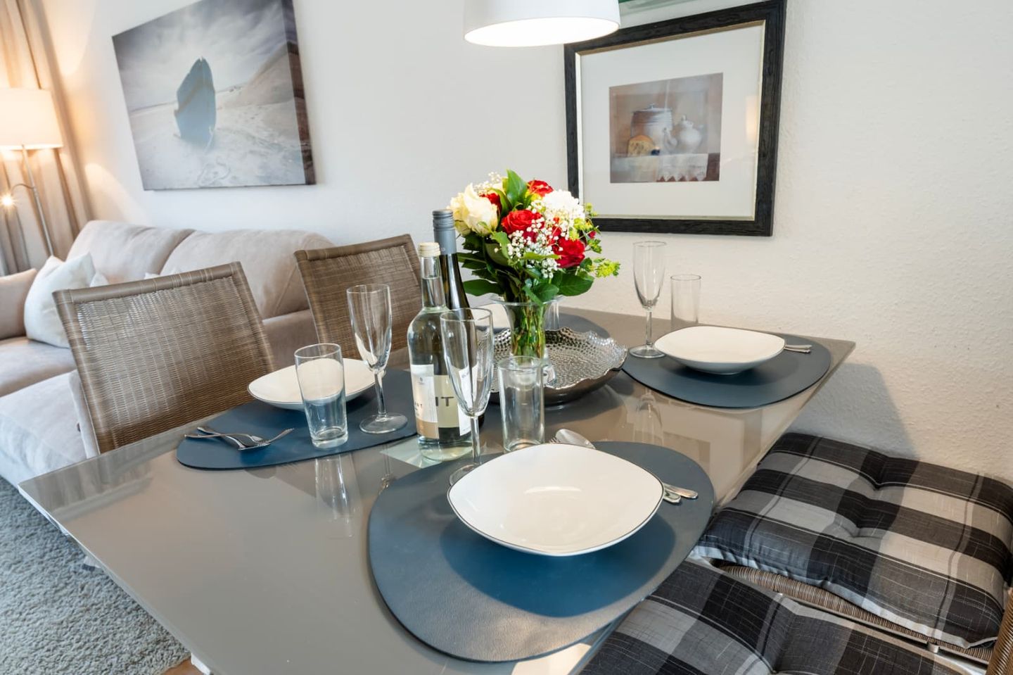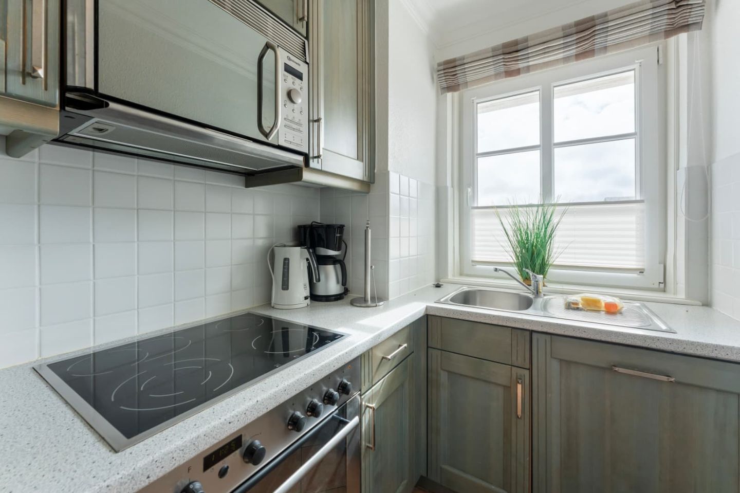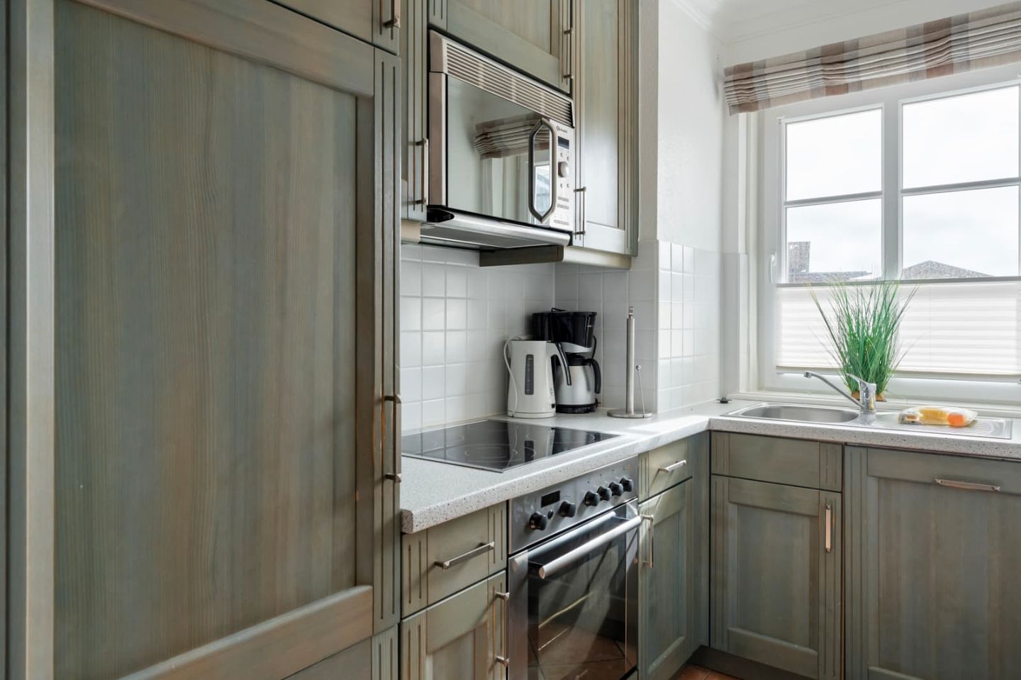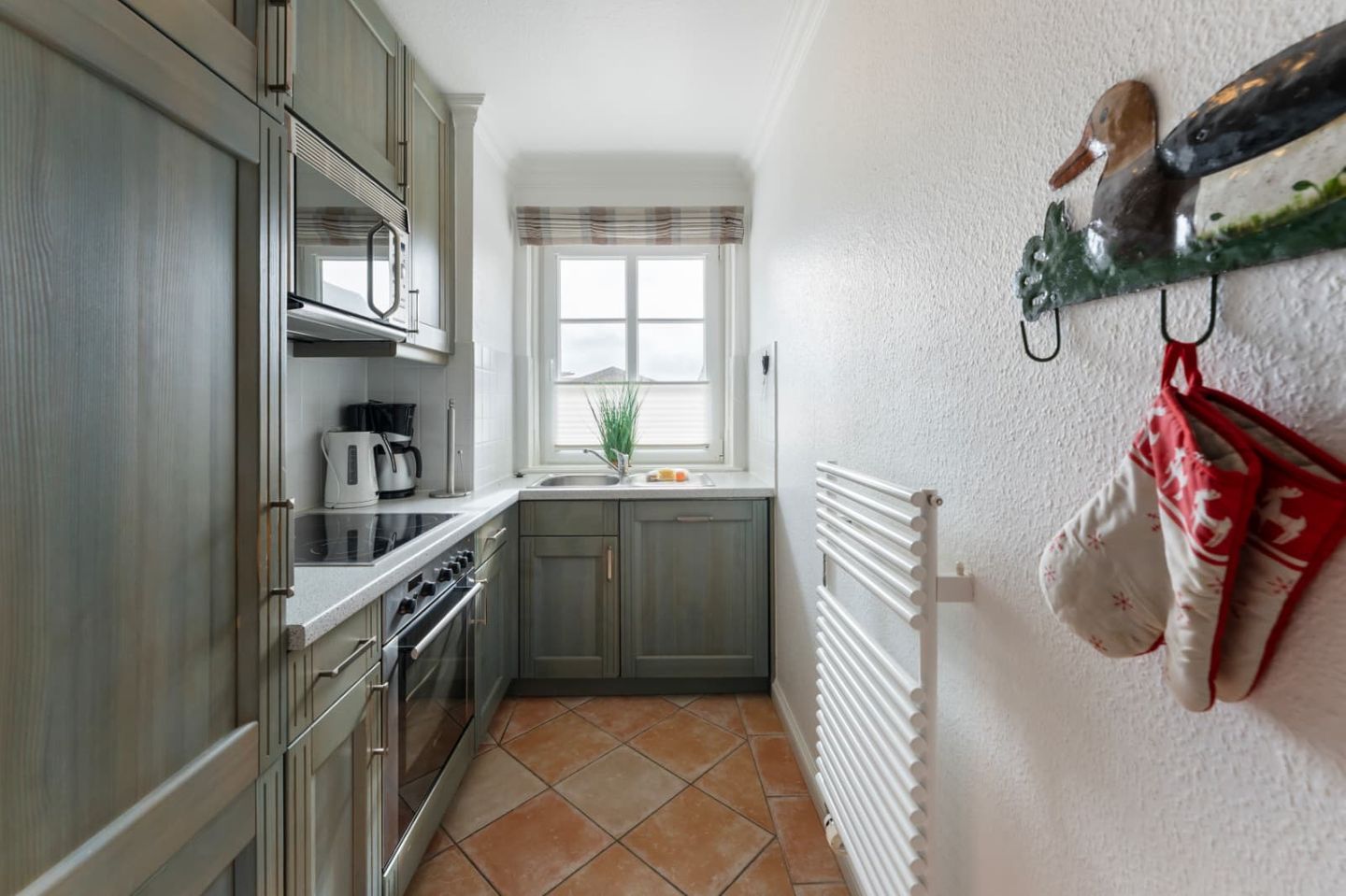 Die Küche in grauer Holzoptik ist geschickt in den Raum integriert und bietet so viel Stauraum und Arbeitsfläche. Ein Ceran-Herd mit Backofen und ein Geschirrspüler sind Teil der Ausstattung. Der Esstisch bietet allen Gästen einen gemütlichen Platz zum Speisen.