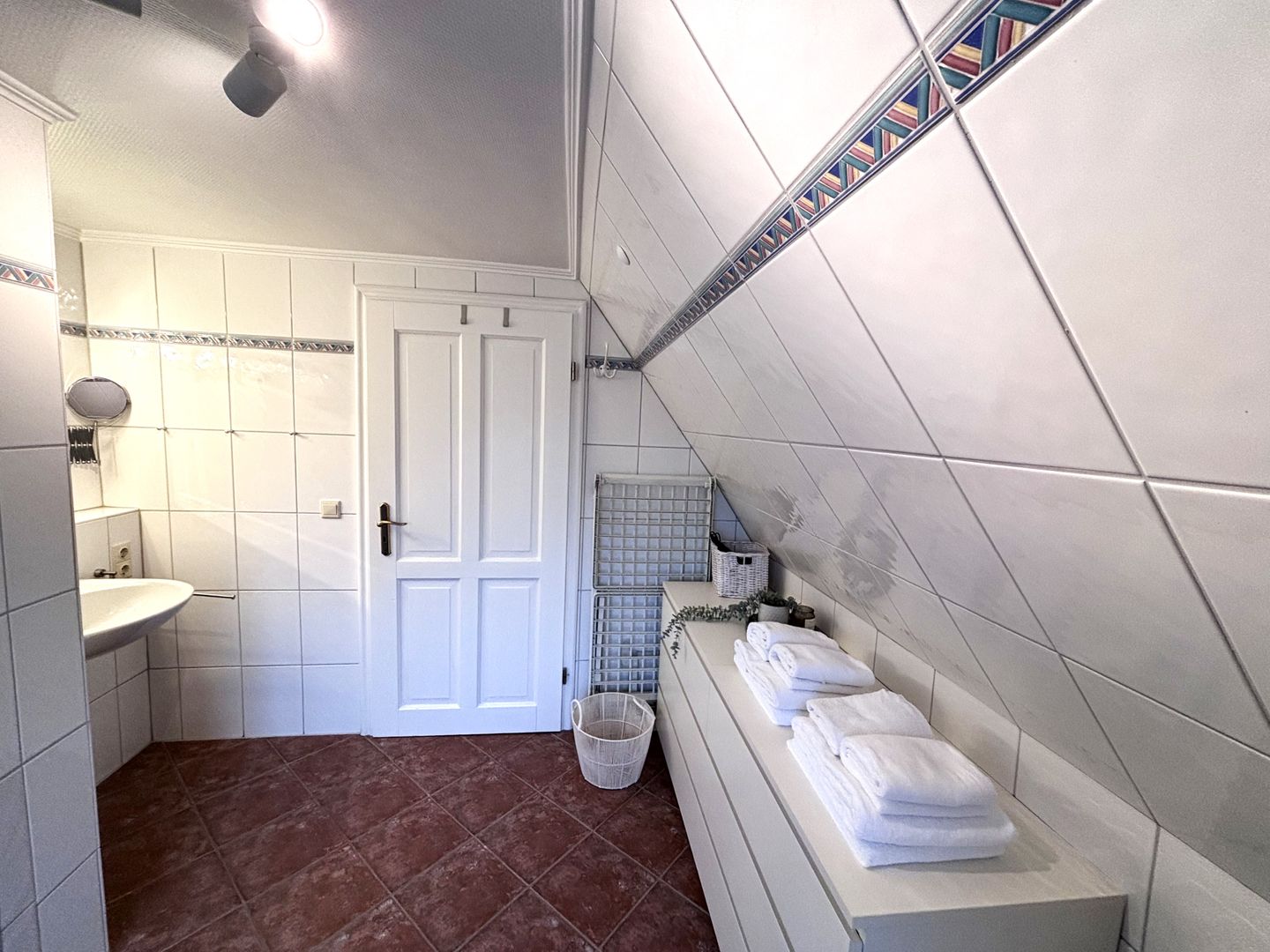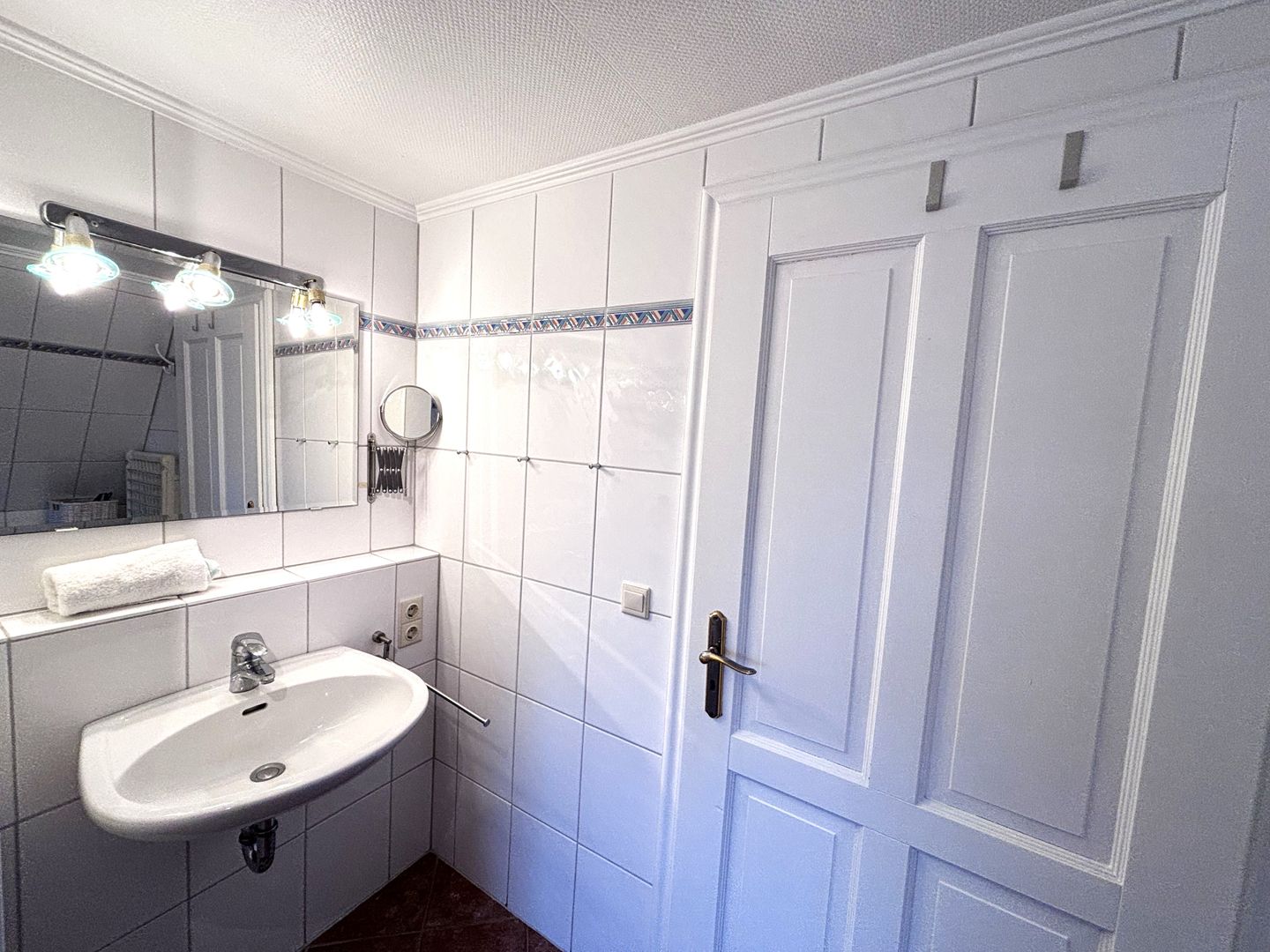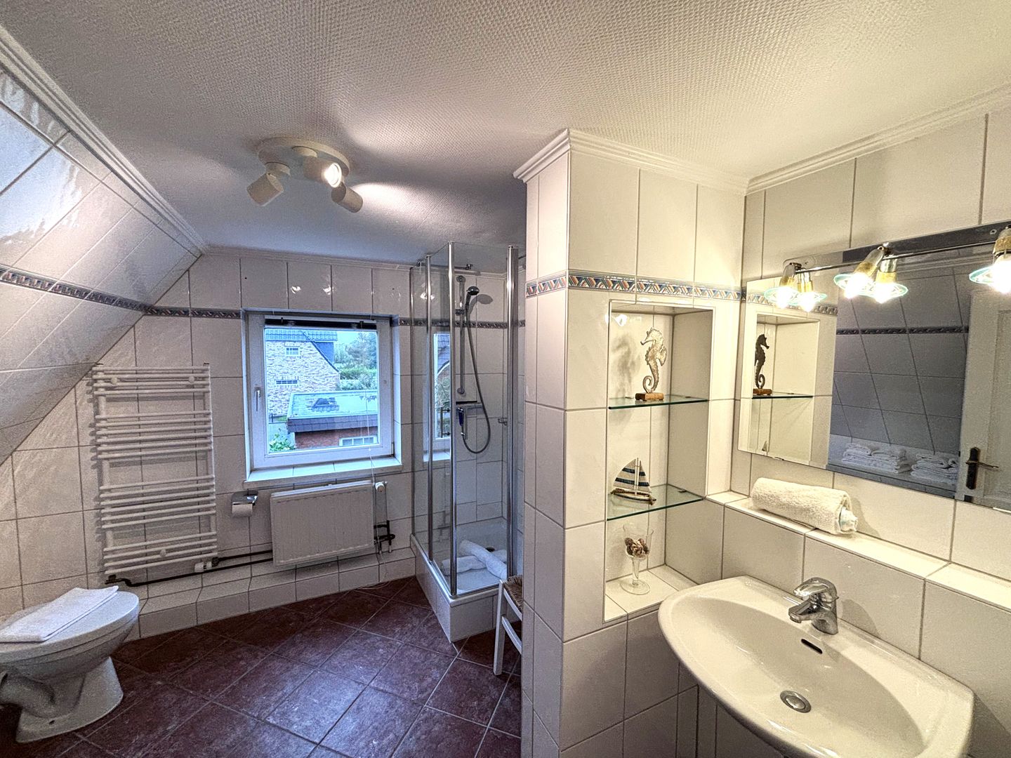 Das Badezimmer der Ferienwohnung verfügt über ein WC, ein Waschbecken, sowie eine Dusche.
