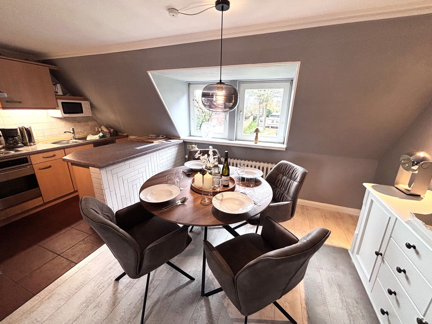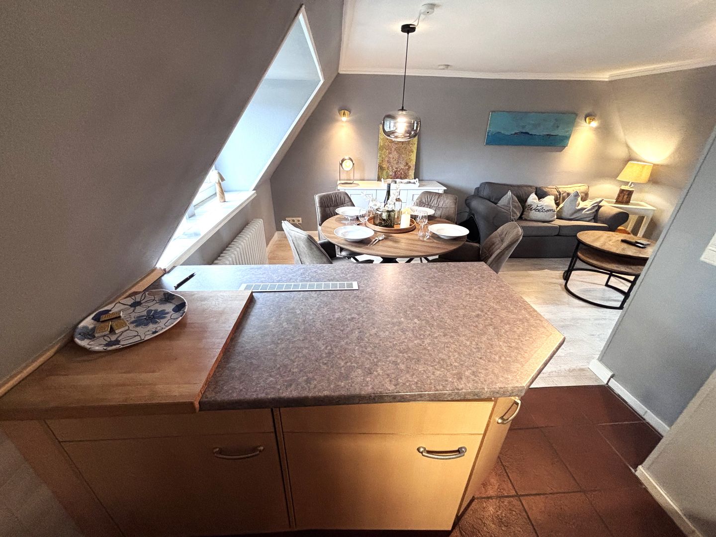 Die zum Wohnbereich angrenzende offene Küche verfügt über ein Cerankochfeld und ist mit einem Esstisch ausgestattet der Platz für 4 Personen und leckere Speisen bietet.